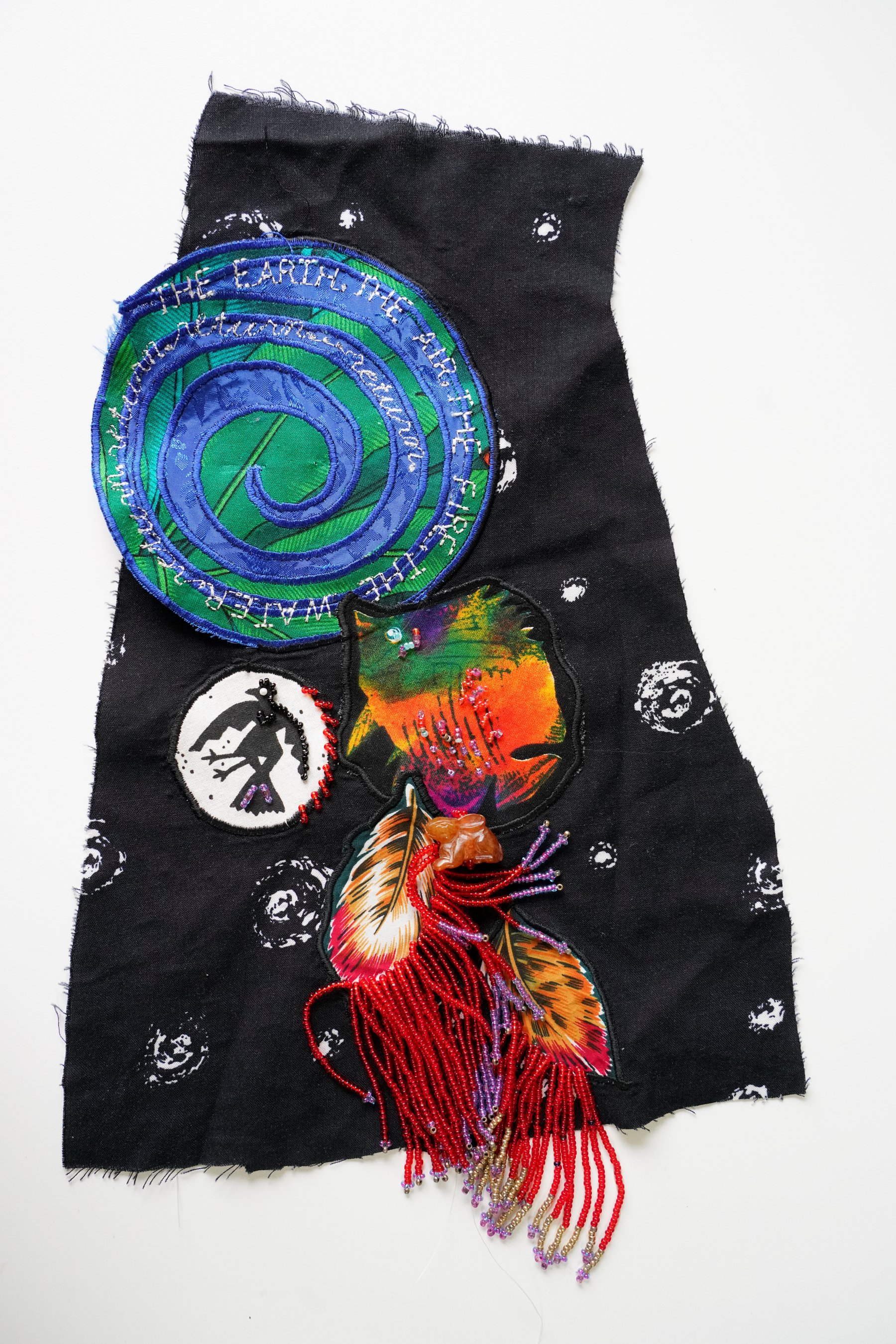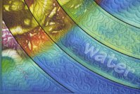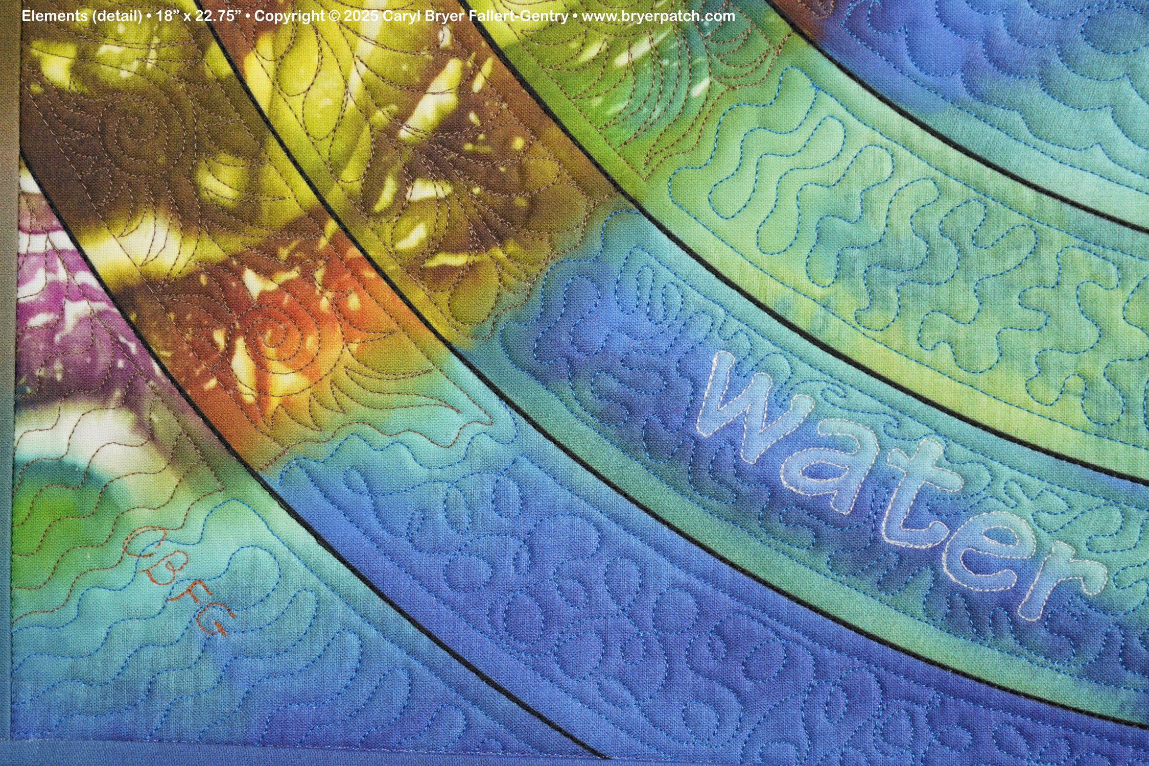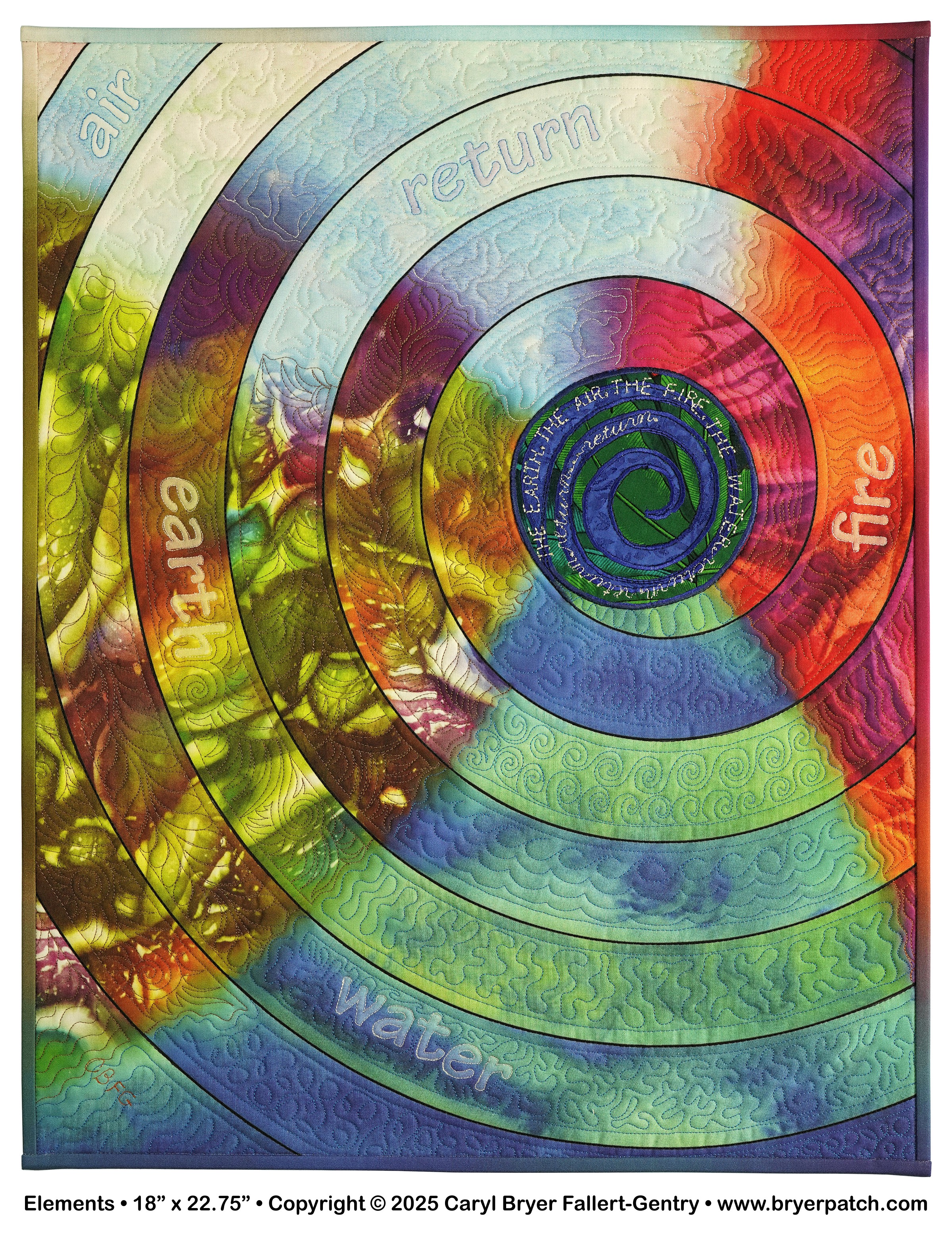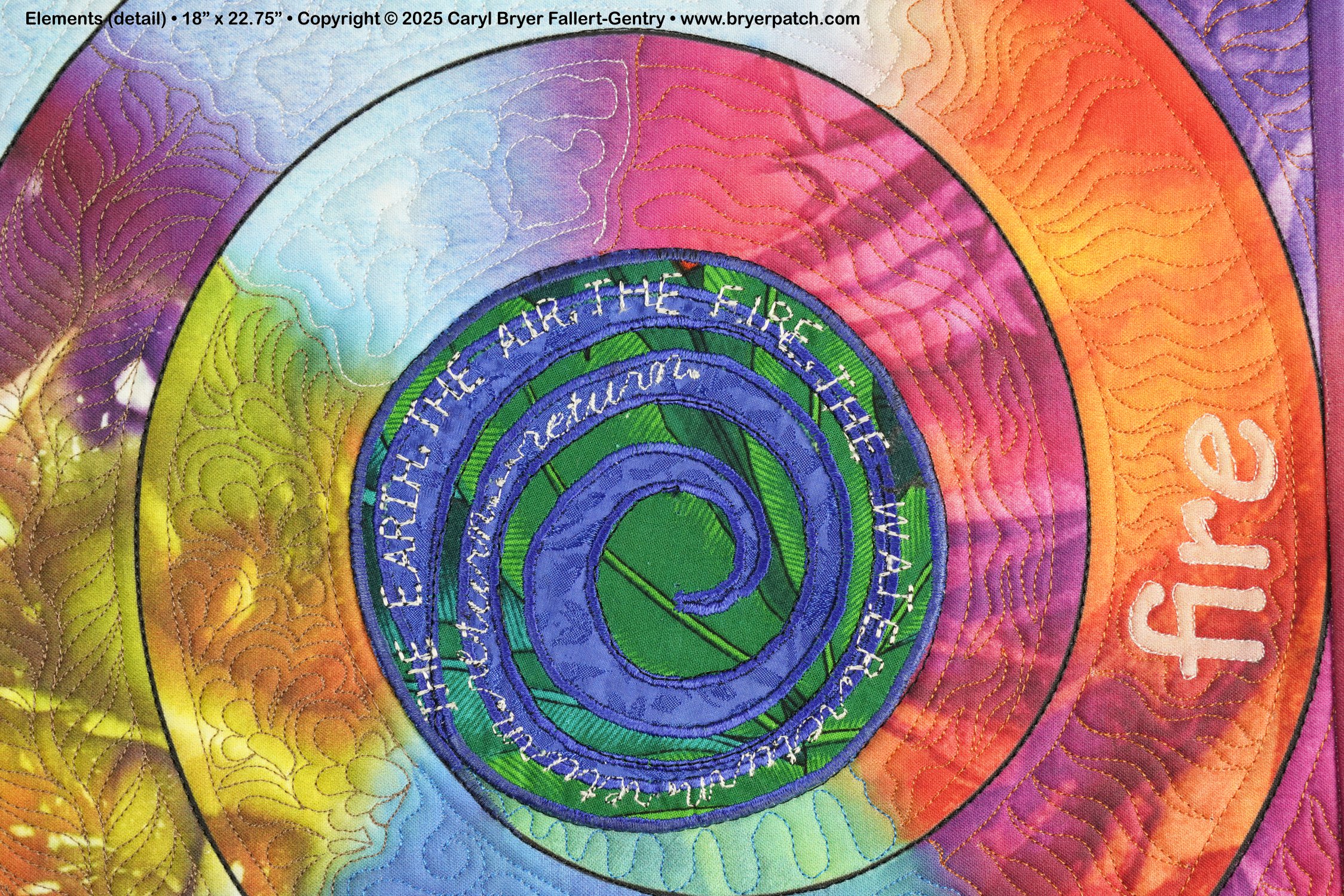 I stitched the polyester spiral onto the background fabric in the center of the spiral then outlined the semitransparent words with stitching. The rest of the spiral was free-motion quilted in patterns that represent the four elements. |