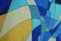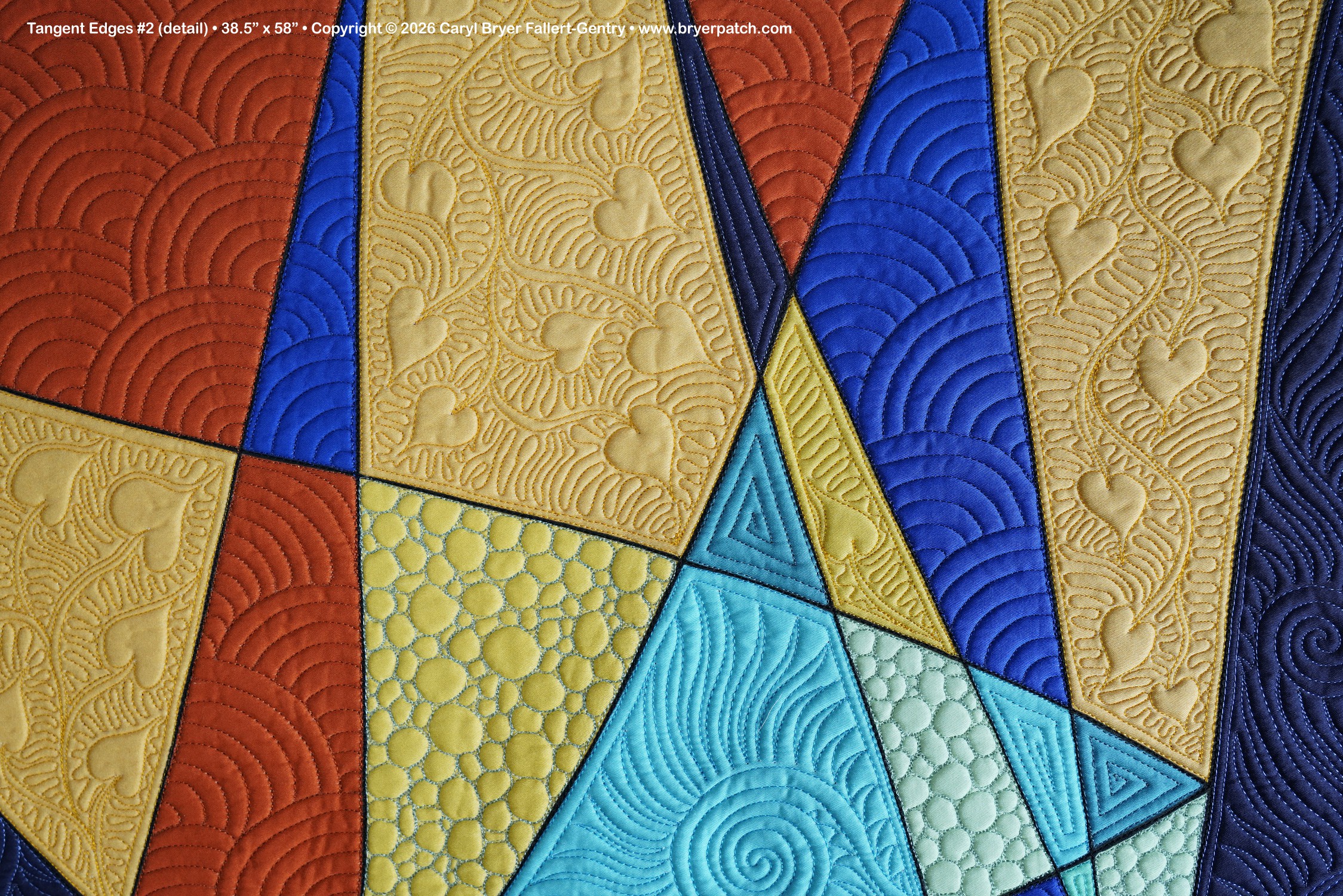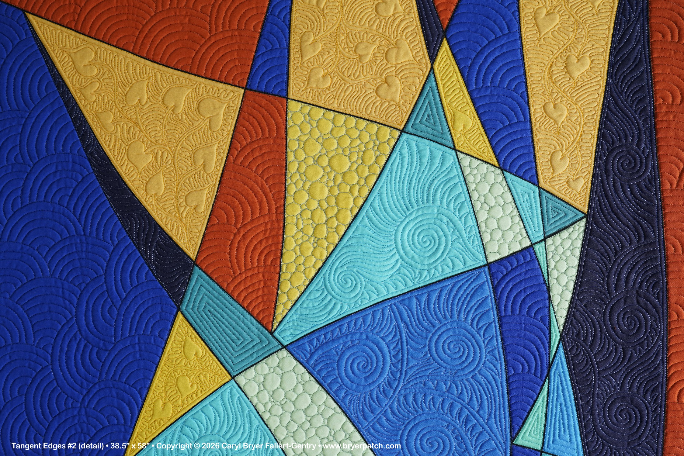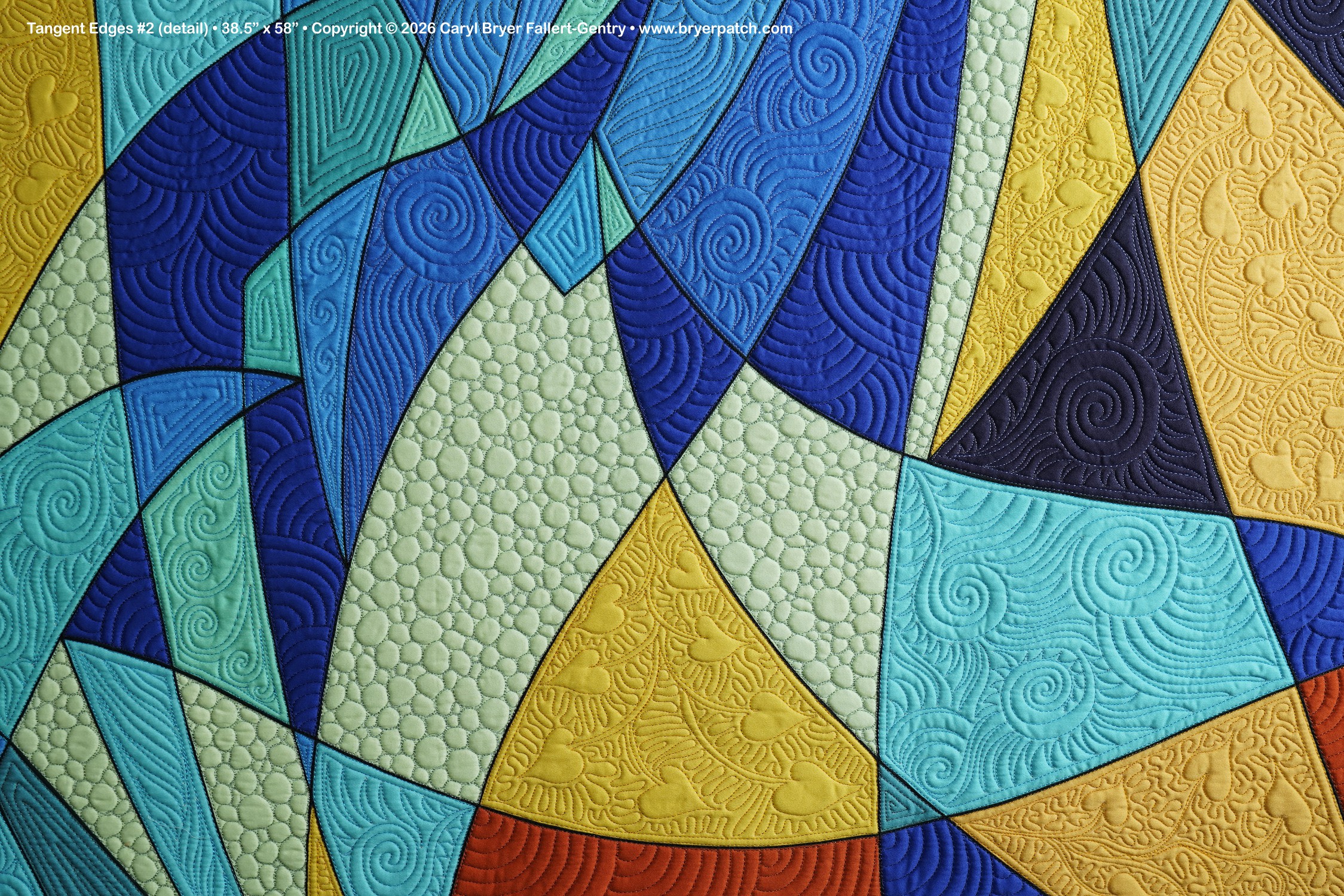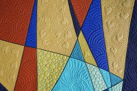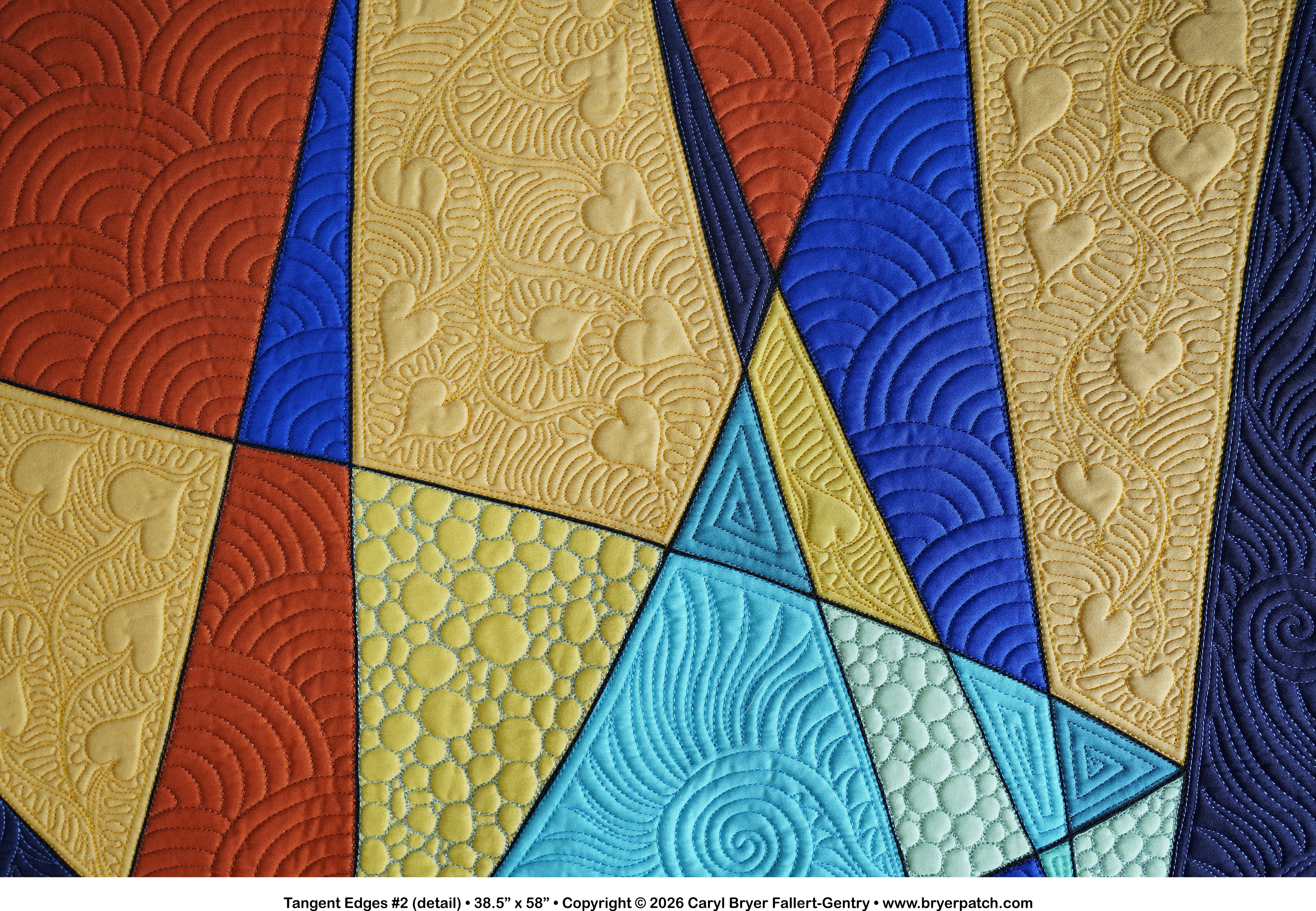 I designed matching binding strips for each version and sent the digital file to Contrado.com to be printed on cotton sateen. In the colored spaces I had fun playing with many different free-motion machine quilting patterns. |