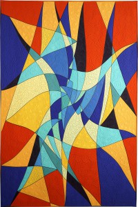 In this quilt, I challenged myself to make a design in which all the edges are tangent. I began with simple triangles whose points all intersected with the side edges of other triangles.