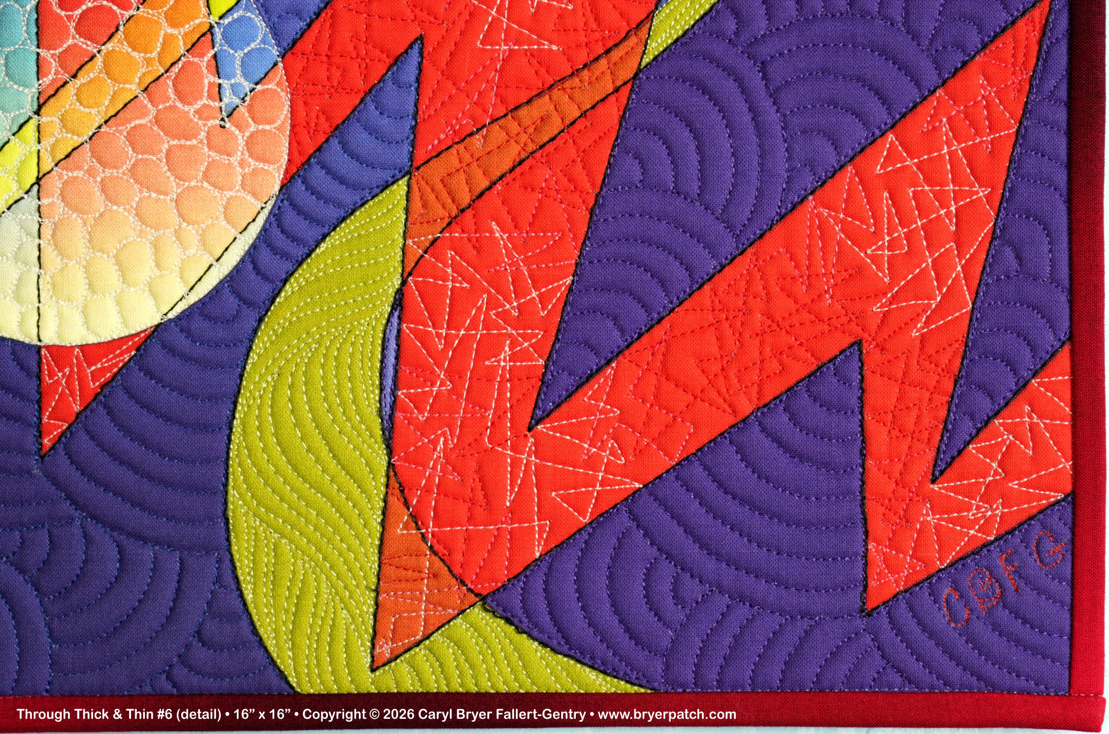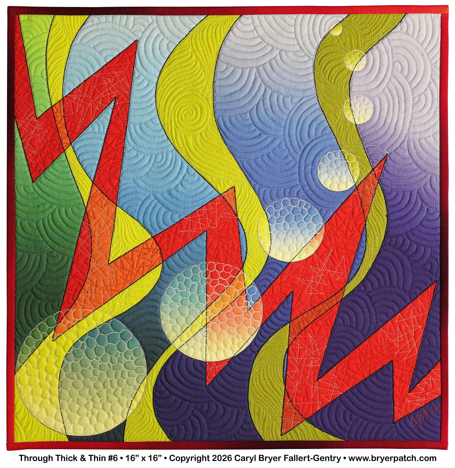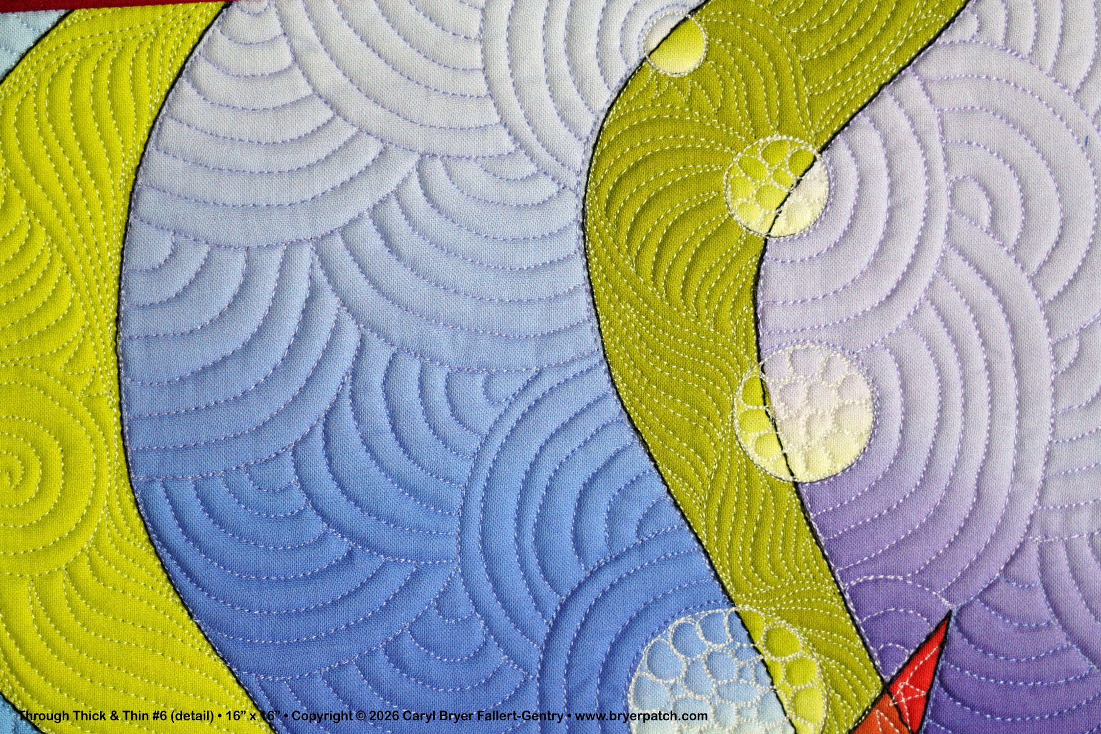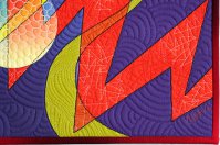 This is one of a series of quilts that combine zigzags and curved shapes, in this case, thick and thin waves and graduated orbs. I turned my line drawing into separate shapes and graduated the colors and values within each shape. Where the shapes crossed, I used different colors, which makes every shape appear transparent. The quilting was done with many different thread colors and patterns. The backing fabric is from one of my collections for Benartex. This is a miniature version, in completely different colors, of my much larger quilt Through Thick & Thin #1. |