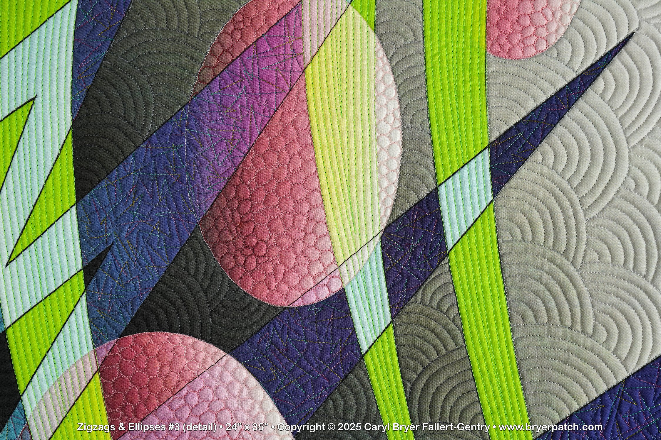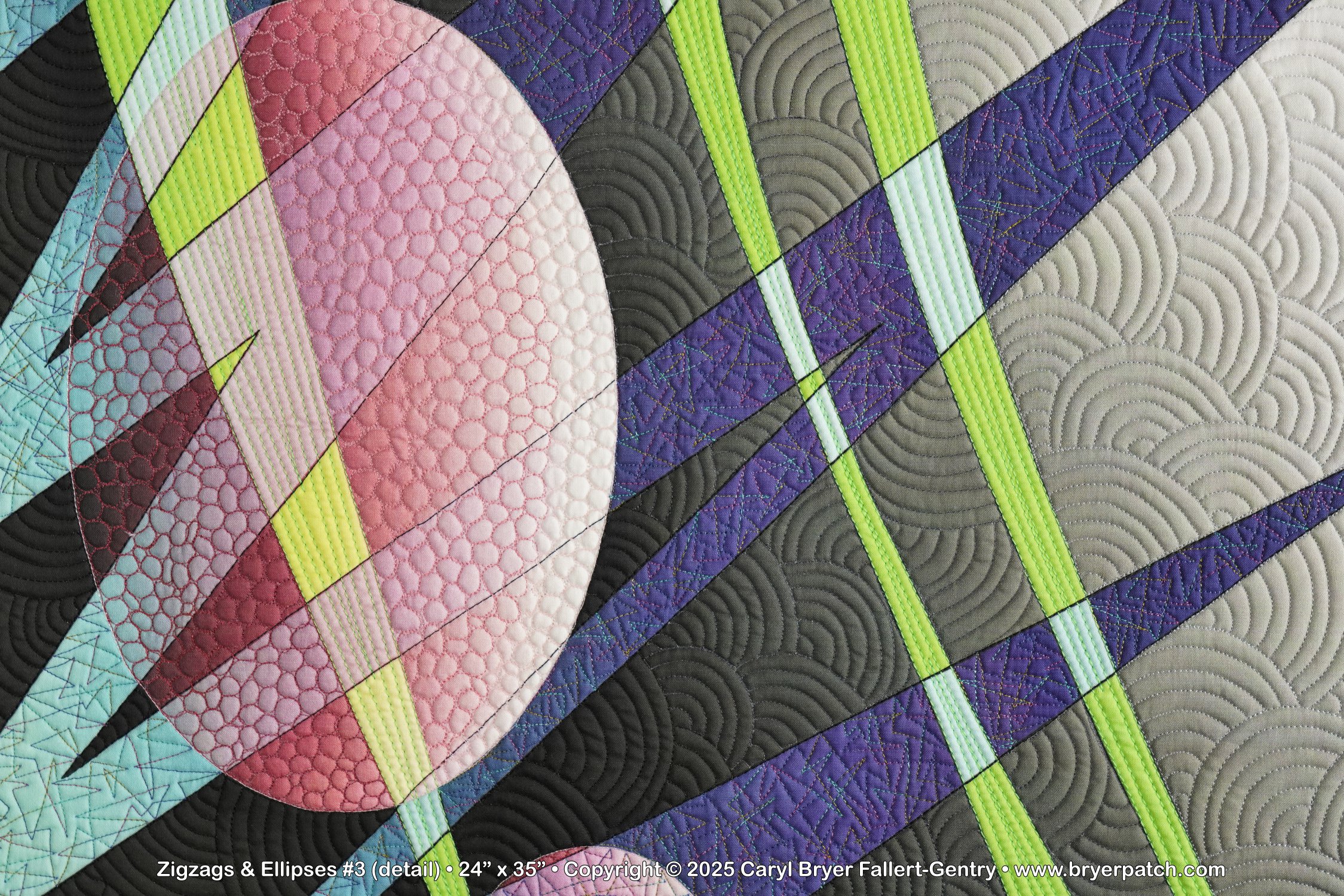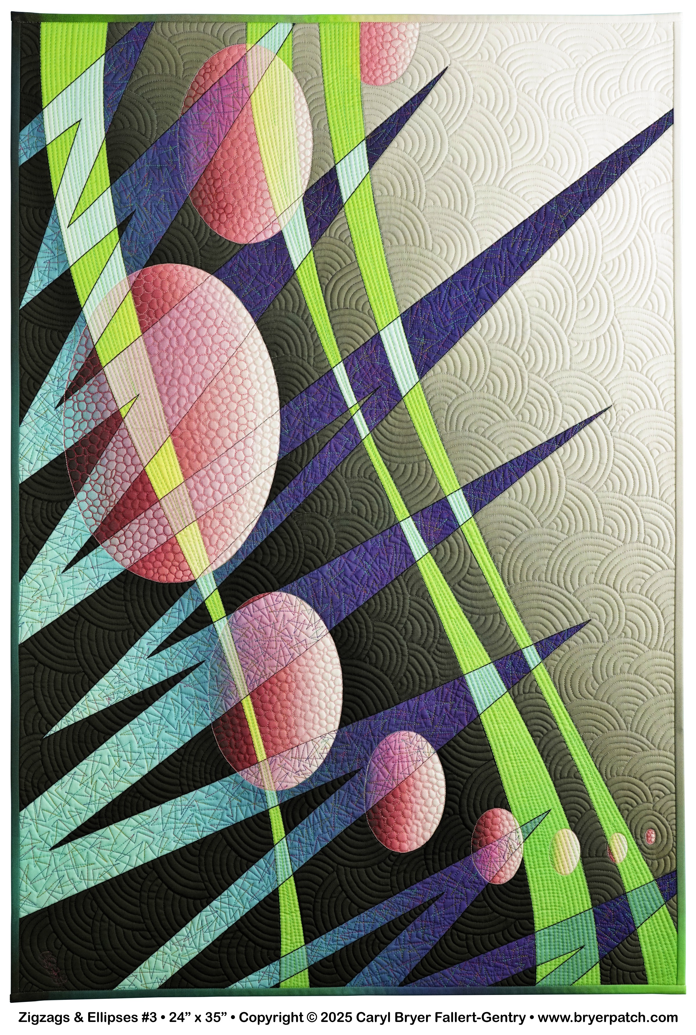 This design grew out of my series in which I combine freeform zigzags, circles, and a few freeform curves. In this case, I turned the circles into ellipses that ended up looking like eggs. I drew and painted the whole design in Corel Draw and had it printed by Spoonflower.com. As I arranged the shapes in the design, I made the areas where they overlapped into separate shapes and chose duller colors in those shapes to create the illusion that all the shapes are transparent. I shaded each shape from light to dark or color to color to create the illusion of an inner glow. Each of the ellipses also seems to fade away along one edge. I quilted the black lines and the wavy green shapes with a regular sewing machine foot (feed dogs up) and heavy #30 top stitching thread, and in the rest of the quilt I used free-motion quilting (feed dogs down) in many different colors of polyester & acrylic thread. |