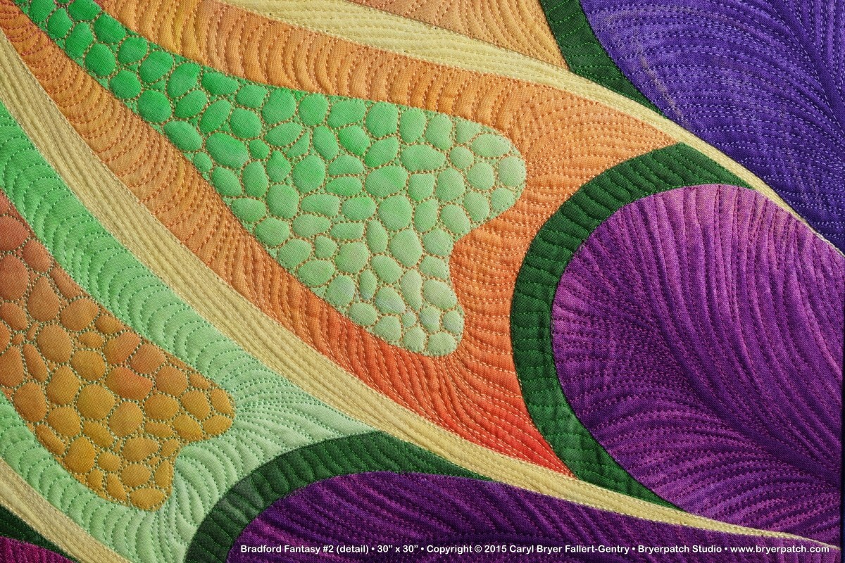 All of the fabrics in the center of the quilt were hand painted and dyed. The outside border fabrics are from my Caryl’s Feather collection, which I designed for Benartex.