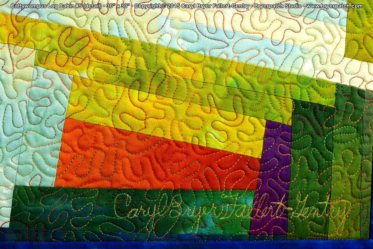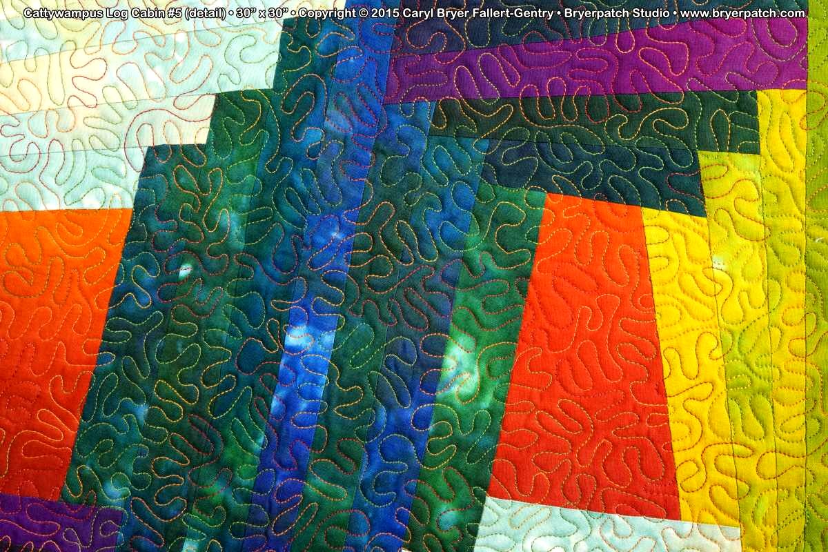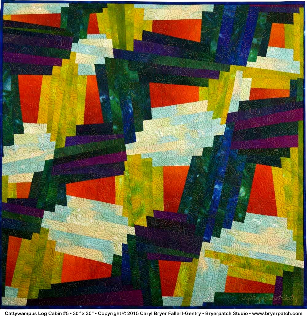 I have always loved traditional log cabin quilts, but wasn’t interested in making one in a traditional way. This quilt was constructed like a traditional log cabin except that none of the blocks are square. Instead of using a rectangular grid I drew lines at various angles so the blocks became quadrilaterals of different sizes and shapes. The pale green and beige fabric is from my Splash collection for Benartex. The remaining fabrics were hand-painted with dye.