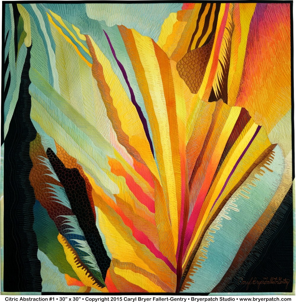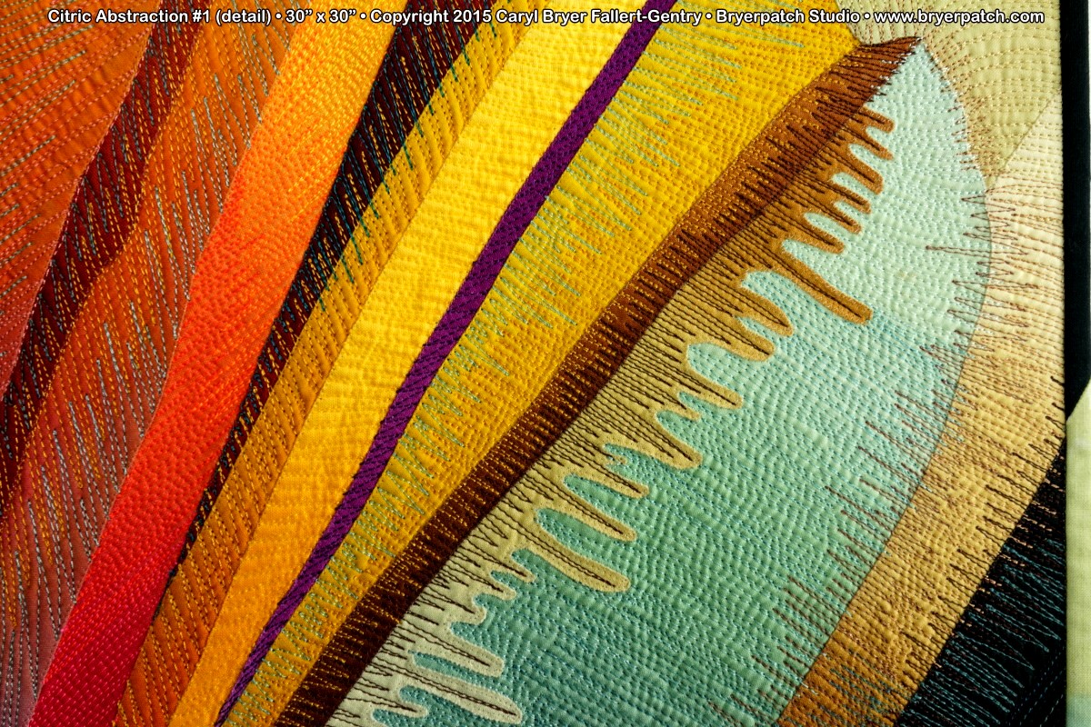 The fabrics are from my Gradations collection for Benartex. In the quilting I used dozens of different colors of thread, shading each area with at least two different colors, often contrasting with the colors underlying fabrics. Most of the quilting zigzags in straight lines to suggest the crystalline structure that inspired the design. |
