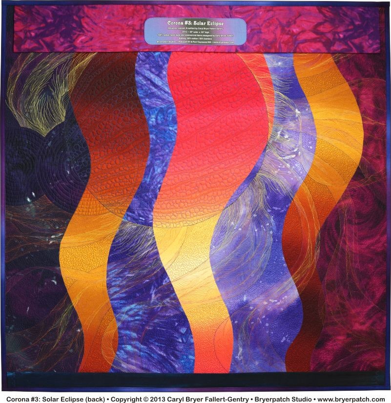 Since the first two solar eclipse quilts had pieced backs I decided to do a curving, pieced back on this quilt also. The back is made from fabrics in my Gradations, Splash, Atmosphere, and Multi-Tye-Dye collections for Benartex.