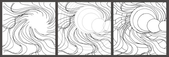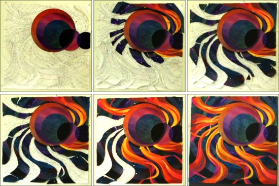 My best-known quilt of all time is probably Corona #2: Solar Eclipse, which is now in the collection of the National Quilt Museum. For my 30th anniversary show in 2013 it seemed appropriate to visit this theme again. I made a new drawing that is similar to the drawing for Corona #2, but this time it needed to fit into a perfect square so, although there are many similarities, this is a completely new drawing. I made a series of sketches until I found one that I liked. The sketch was projected onto freezer paper to make a full-sized pattern. The freezer paper was cut into individual pieces which were used as templates for cutting the fabric. The flames were drawn in sinuous curves, with ribbon shapes overlapping. The sun, moon and negative, background areas are perfect circles drawn with a compass.