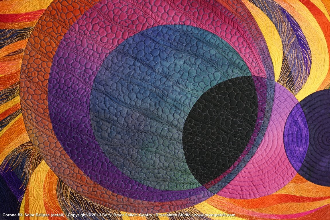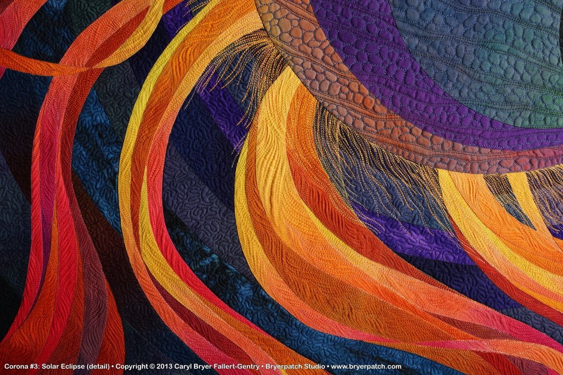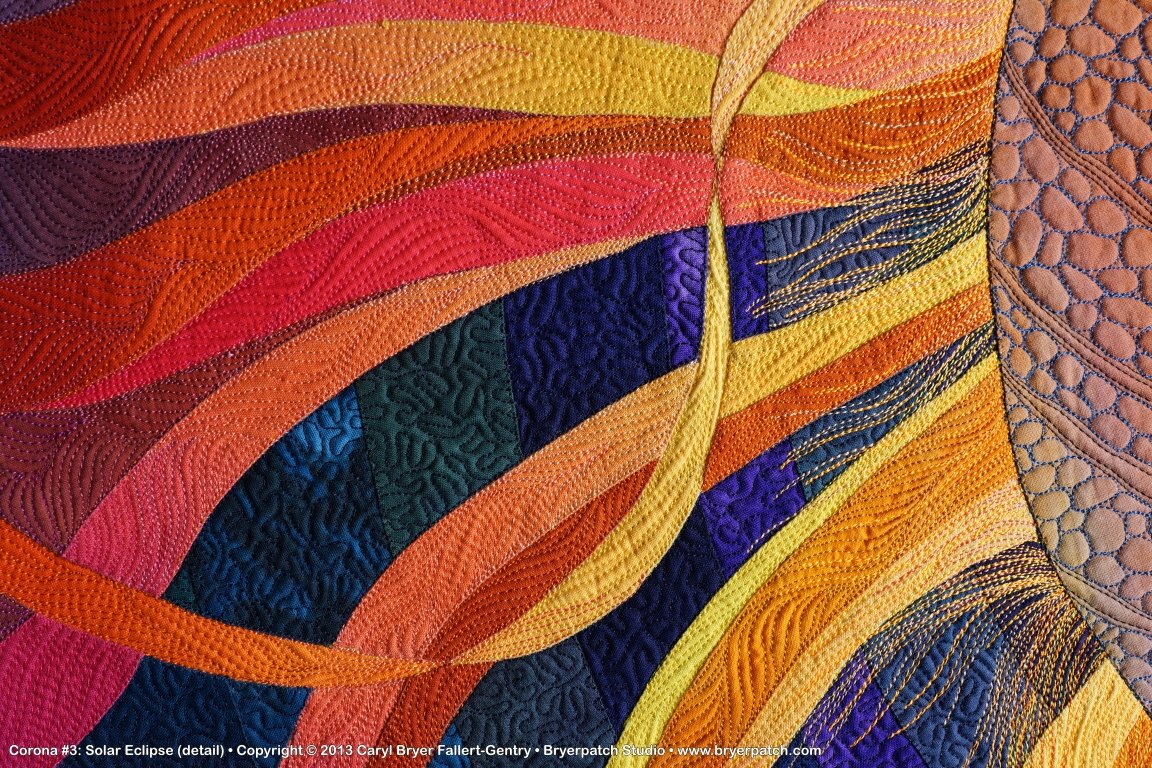 I have often joked that if they would give it back, I would put more quilting in Corona 2. So this was my big chance. Every inch of Corona #3 is quilted heavily, almost to the level of machine embroidery in some areas. If I had put this much quilting into Corona 2, I would probably still be working on it 24 years later.