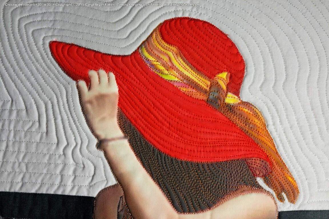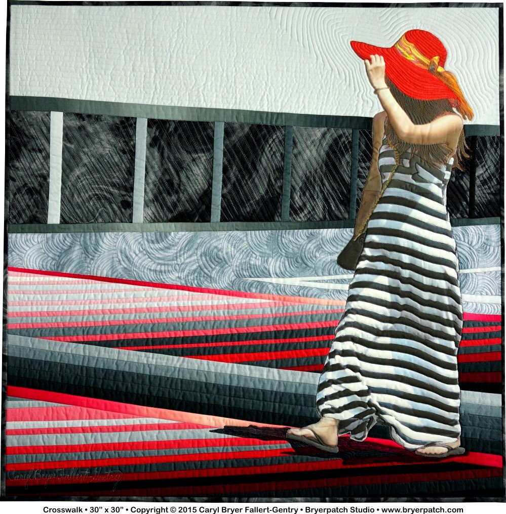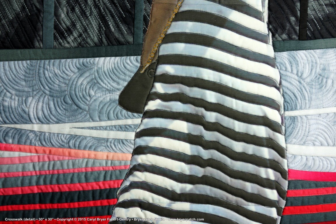 The figure was printed on an ink-jet printer. I borrowed lines from the crosswalk for the striped areas, which are pieced from fabrics dyed in light to dark gradations of red and black. The patterned, grey fabrics are from my Atmospheres collection for Benartex.