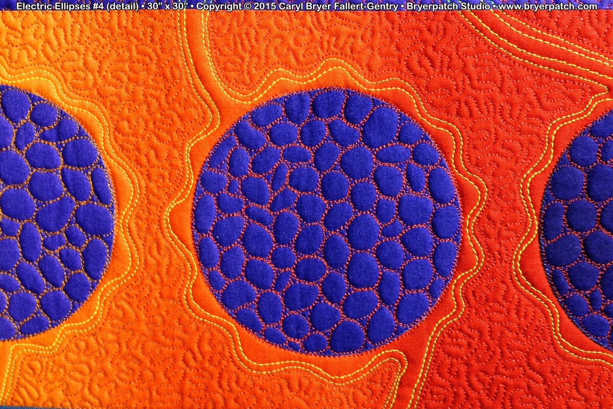 This is one of a series of quilt made in my ongoing attempts at simplification. The Electric Ellipses quilts are based on a series of circles and rectangles in which the colors are juxtaposed to create maximum impact. The four fabrics in this quilt are from my Gradations collection for Benartex. The quilting was done in organic patterns, which make the circles look like part of a microscopic organism. The small circles are quilted with a pebbly pattern in the colors of the background fabrics, making the pebble shapes appear to float. A fifth fabric from the Gradations collection was used for the binding. |