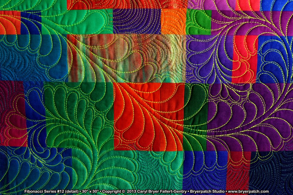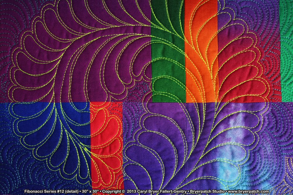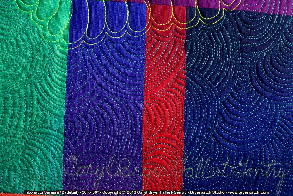 back. This piece is quilted in wavy feather patterns running from the bottom edge to the top. The three feathers are quilted in fluorescent yellow top stitching thread. The negative spaces are quilted with darker threads in spiral and crescent patterns. |