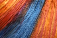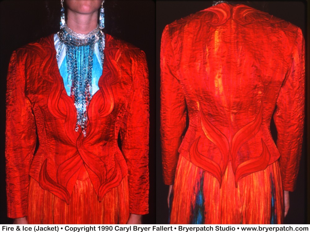 The ensemble begins with a fitted jacket of silk satin, hand painted with fiber reactive dye in the colors and patterns of fire. The jacket is quilted on Cotton Classic batting, using Sulky rayon embroidery thread. It is embellished with sculptural machine appliqués, made of silk satin flame fabric, cotton classic batting, and rayon embroidery thread. The jacket lining is of china silk, painted with dye in the colors and patterns of ice crystals.