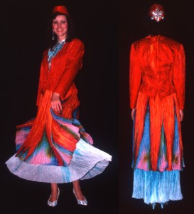 The skirt of the dress is constructed in two layers. The top layer, attached to the bodice, is hand painted in flame colors. The bottom layer, attached to an underskirt, and flowing from the bottom of the overskirt to the floor, is painted in the colors of ice. The skirt is made from eleven yards of 5mm (very light weight) china silk, which was hand pleated by wrapping with string on a cylinder. The skirt hangs straight when still, and flares out to form a full circle, when the model twirls on the runway. It is meant to be in constant motion.