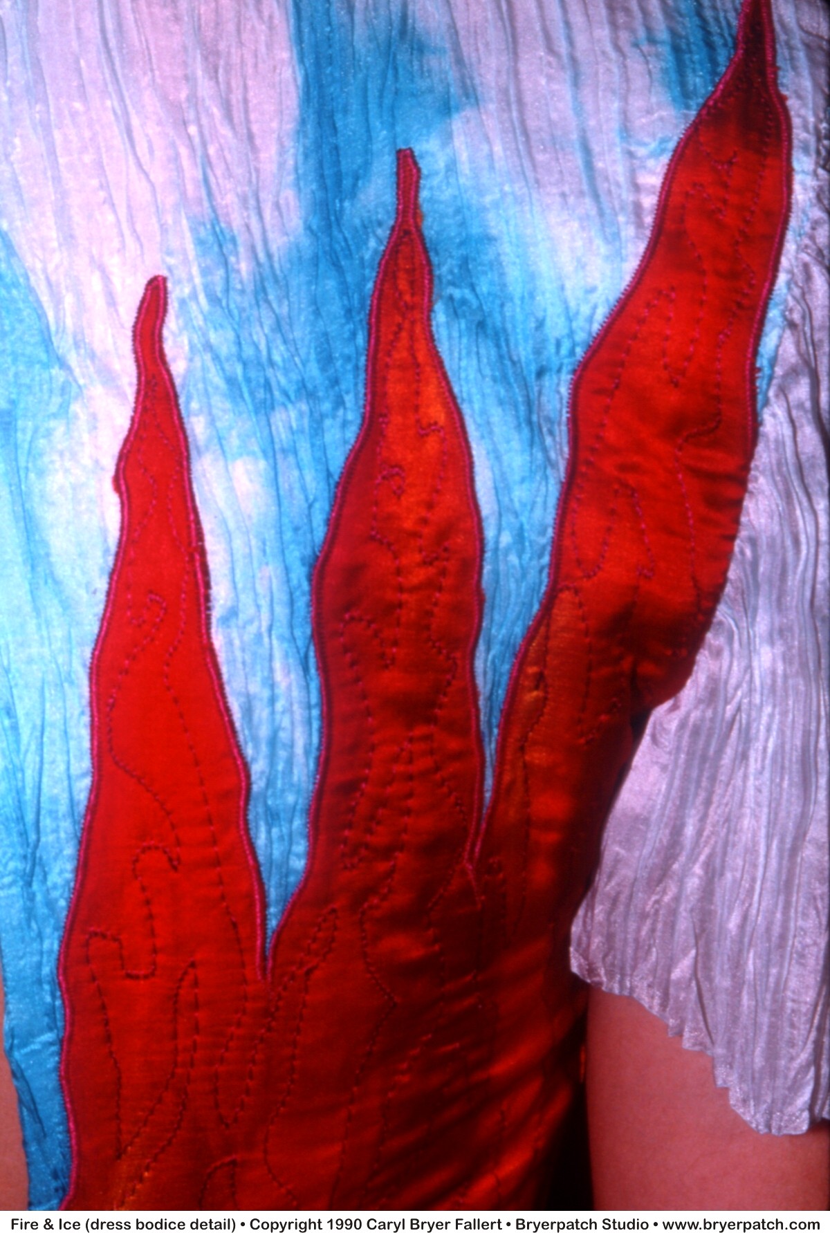 This garment is part of a series of art works based on fire and ice. In these works, fire and ice represent the conflicting emotions of passion for life, and fear, which often prevents full and joyful participation in life.