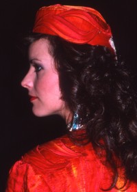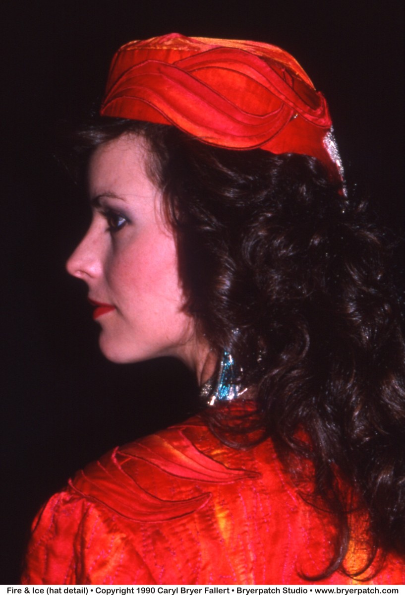 A matching hat of the flame colored silk is embellished with a beaded snowflake.
