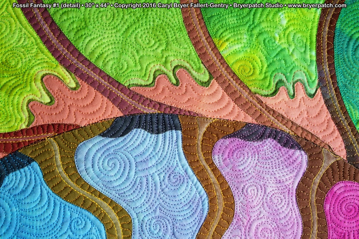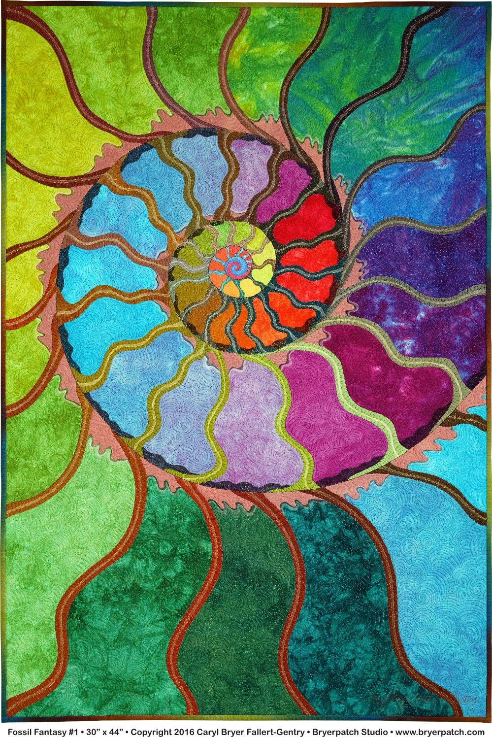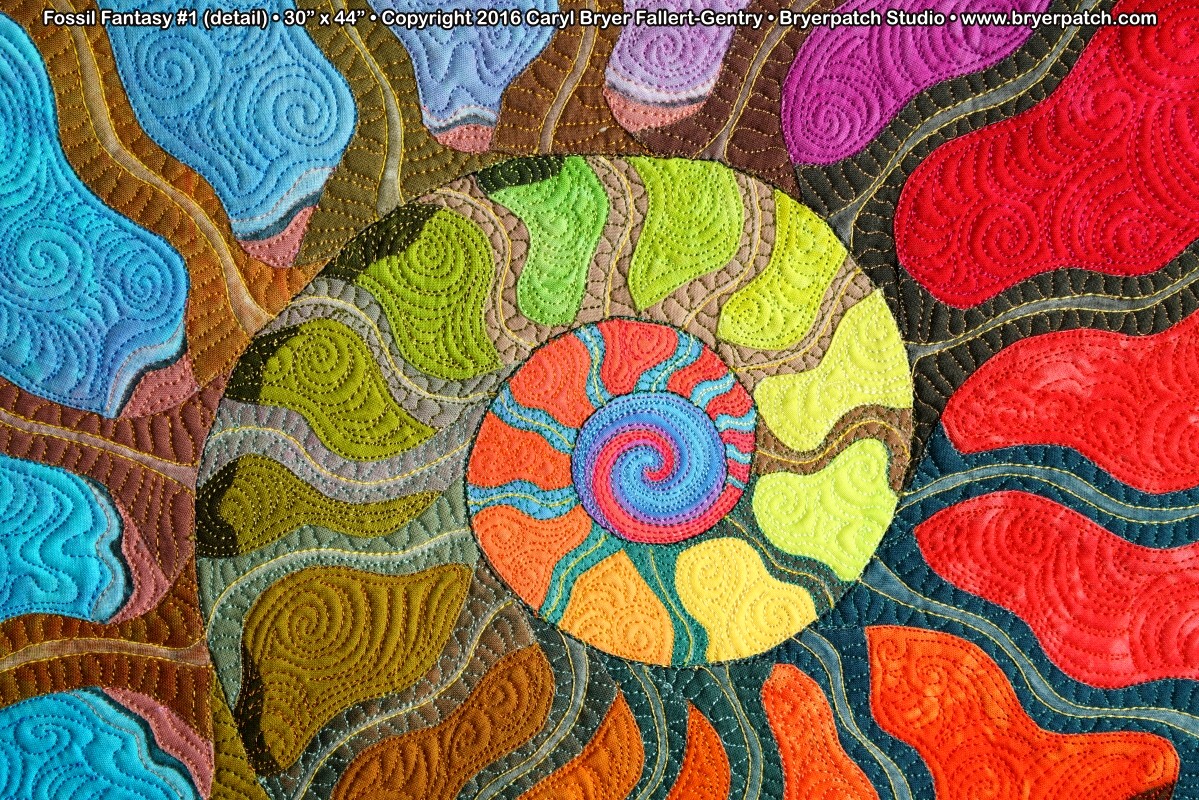 All of the fabrics were painted or hand dyed except the last four inches in the center of the spiral, which was designed in Corel Draw and printed on cotton fabric. I did some additional drawing with ink and pencil on the individual templates. The colors, of course are pure fantasy. I had fun juxtaposing brilliant rainbow hues against a collection of sludgy neutral tones.