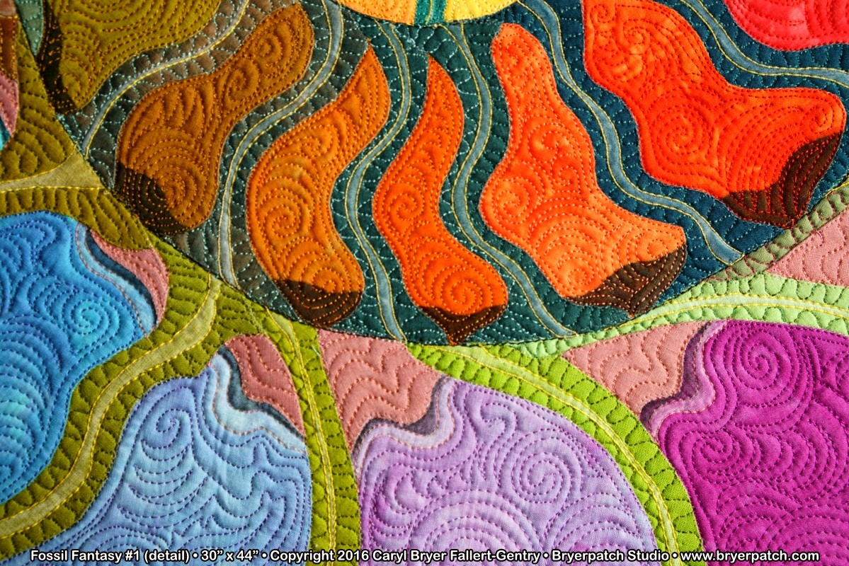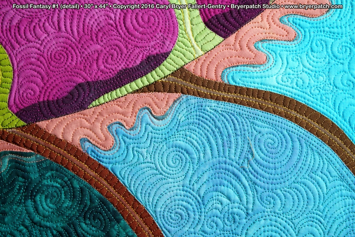 Many different colors of thread where use in the quilting, most of which is done in fantasy spiral patterns to reflect the theme of the quilt. The binding is made from a fabric in my Gradations collection for Benartex, and the backing is from my Atmospheres collection, a spiraling design to compliment the theme.