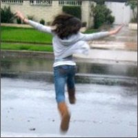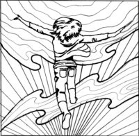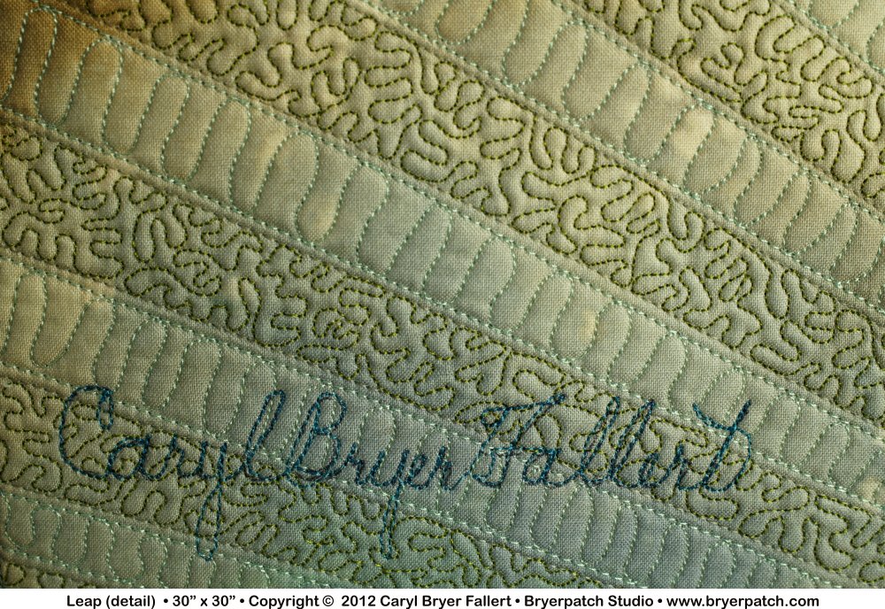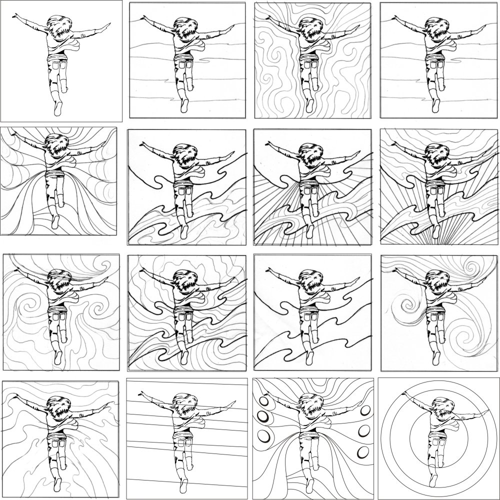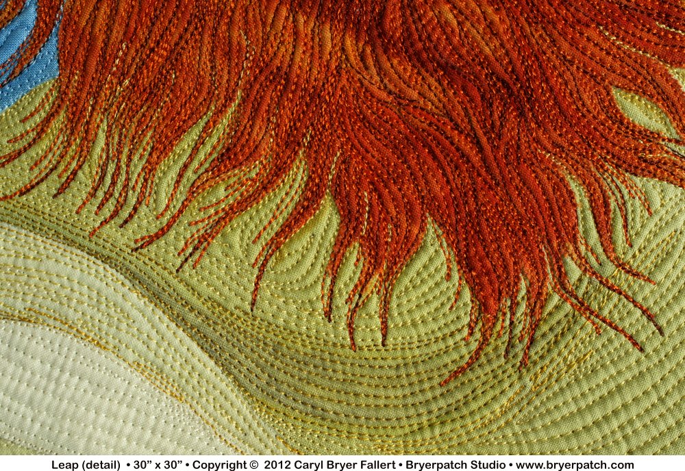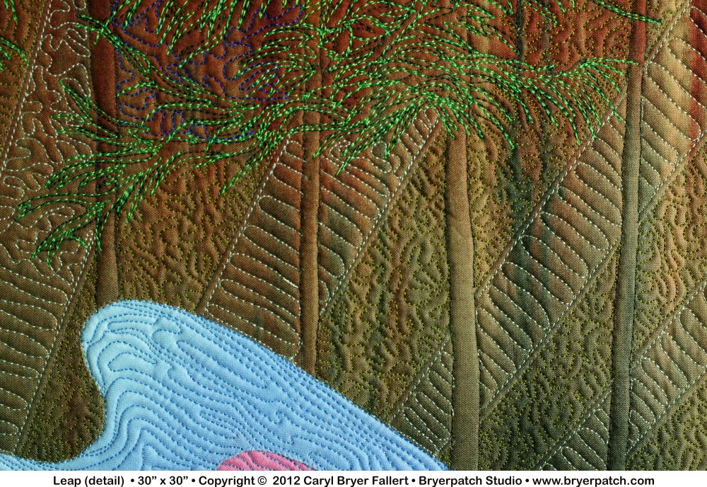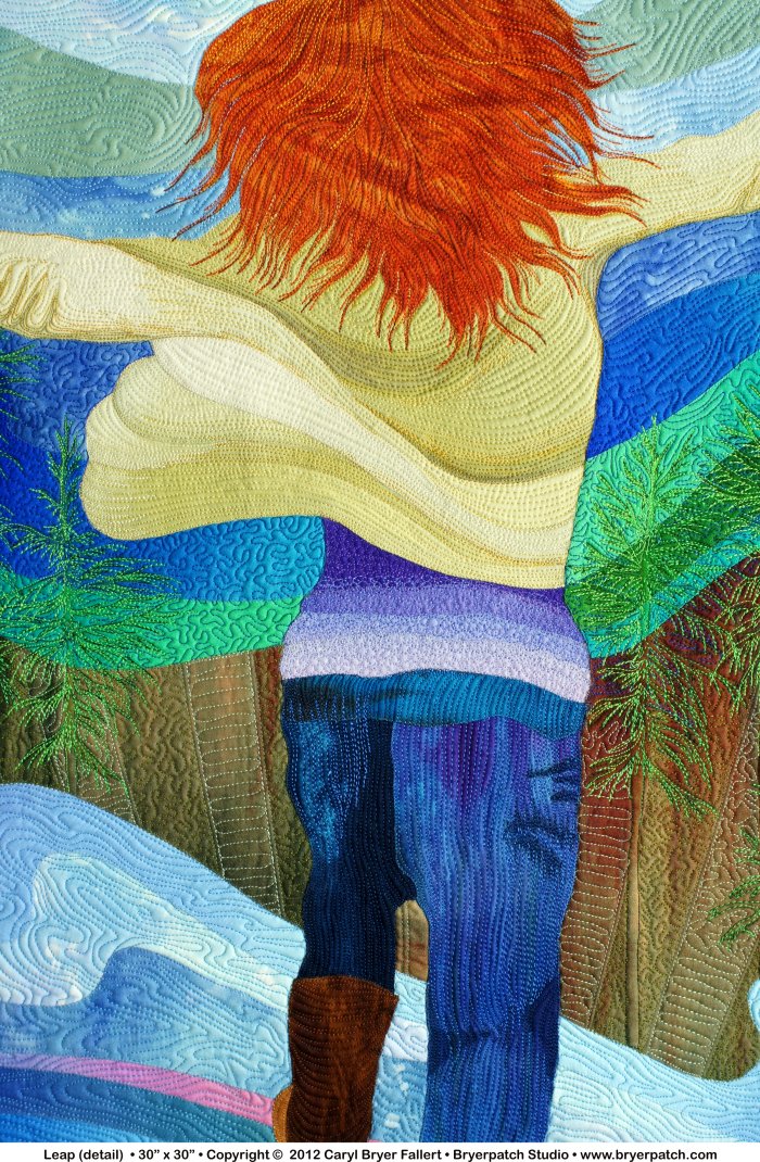 | The design for this quilt was developed after I made a commitment to a new life partner, and also to spending half of my time in the Pacific Northwest. While I was excited about starting a new chapter in my life, I also felt like I was leaping into the great unknown. A picture of my great-niece Marie, jumping over a puddle, provided the perfect image to portray my mixed feelings of fear and exhilaration. Starting with a simple line drawing, I tried many different backgrounds, searching for the lines that best portrayed my feelings. I also tried different ways of integrating the figure into the background and finally settled on a series of swooping curves, many of which grow out of the lines in the figure.