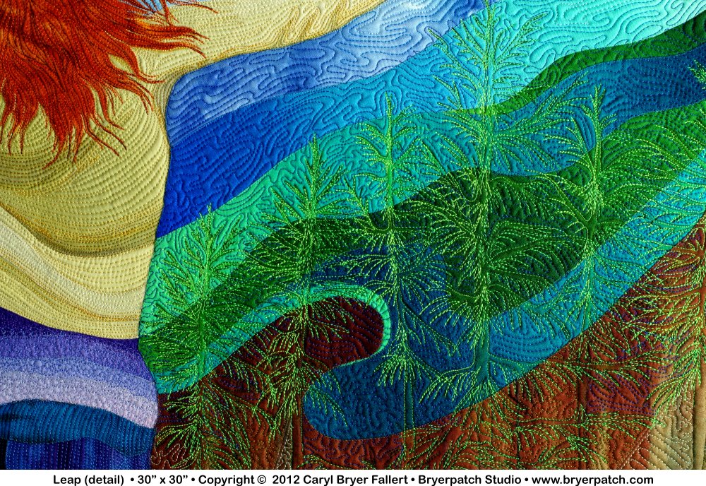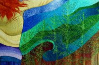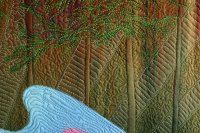 | All of the fabrics in this quilt are from various collections that I designed for Benartex. Some of the shading was enhanced with fabric pencils. Many different colors and values of #40 top-stitching thread were used to complete the images. The fir trees were added entirely with thread and represent my new home on the Olympic Peninsula. I walked around our neighborhood and photographed many different fir trees to get a feel for the shapes of the trees and branches. |