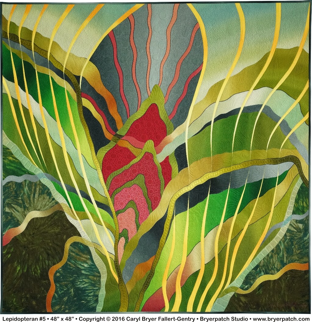 Some of the fabrics were hand dyed. The rest are from the various collections of fabric I have designed for Benartex, and are based on my hand-painted originals. I also added ink and pencil in some areas. The back of the quilt is a single piece of hand-painted sheeting.