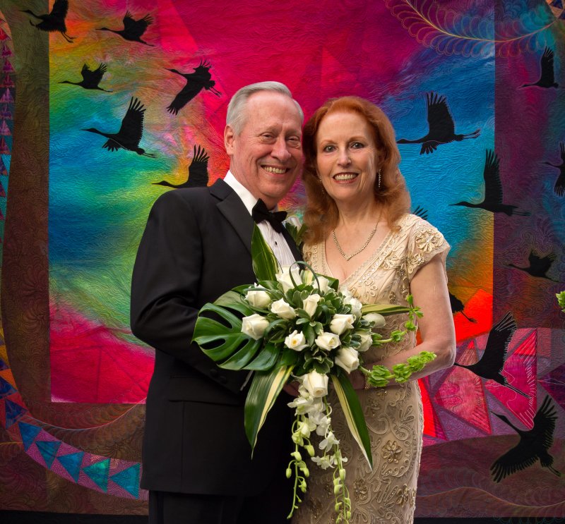 In January of 2013, I married Dr. Ron Gentry in a private ceremony at The National Quilt Museum. Our ceremony was held in front of my 1995 AQS Best of Show quilt, Migration #2, which has 21 black birds flying from the bottom right corner to the top left corner. We chose this piece as a backdrop because we have become migratory humans, spending half of the year in Paducah KY, and half in Port Townsend, WA. This quilt, a miniature version of Migration #2, has only two black birds, and was made to hang at our April, 2013 reception to celebrate our marriage.