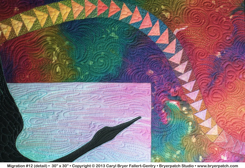 The quilting was done with many different colors of top stitching thread in colors that blend with the background fabrics. A “Caryl Flower”, one of my signature quilting patterns, was quilted into each goose triangle. The black birds, whose species is intentionally ambiguous, are quilted in charcoal grey. They are also outlined in light blue thread to create contrast and make them stand out. |