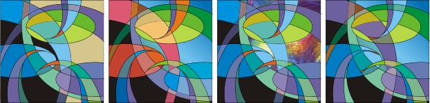 This design grew out of a series of sketches I made in Corel Draw, using crescent shapes and ellipses. I chose the colors to create the illusion that the shapes were partially transparent. The shapes were cut from solid colored fabric, many hand-dyed. The background is divided into light in the top right corner and dark in the lower left corner. The patterned, background fabrics are from two of the collections I have designed for Benartex.