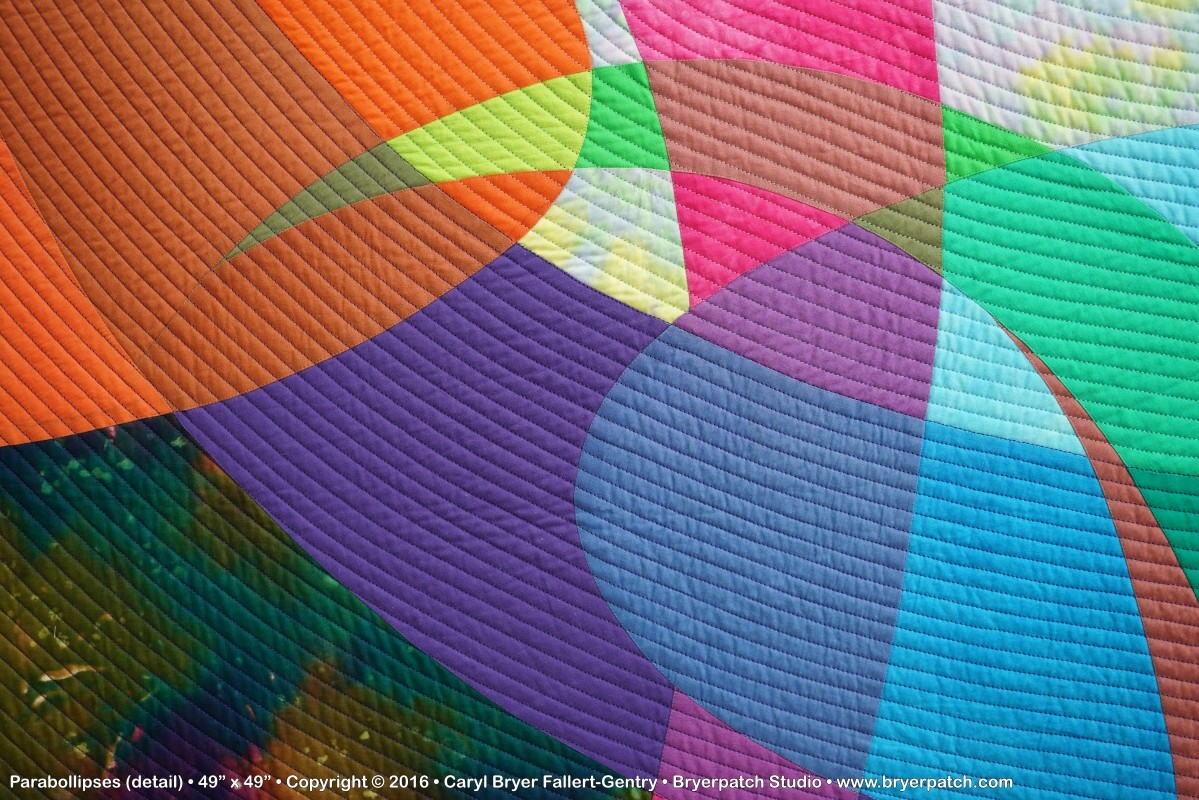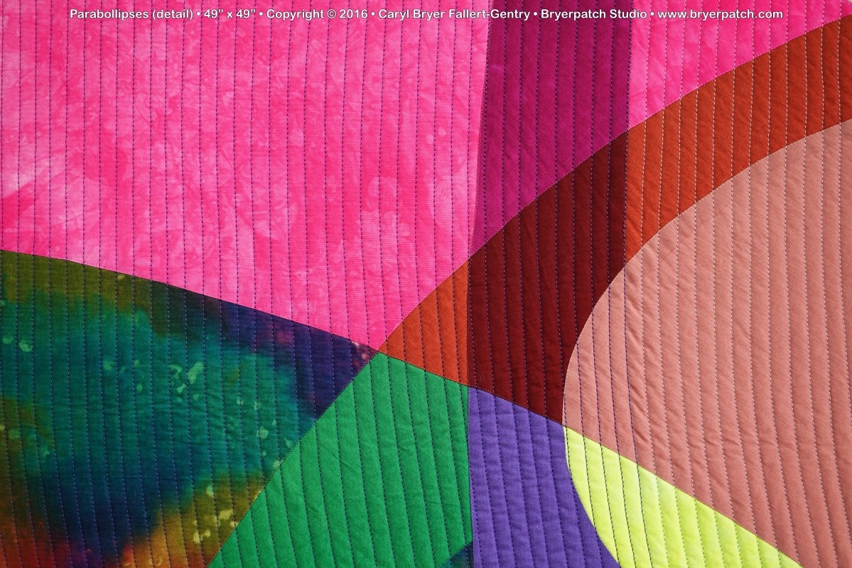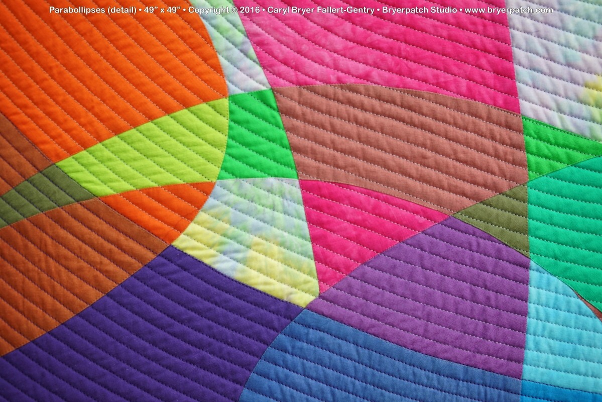When the piecing was finished, my husband Ron commented that there were lots of parabola shapes in it. I decided to invent a title that combined parabolas and ellipses and called it Parabollipses. |