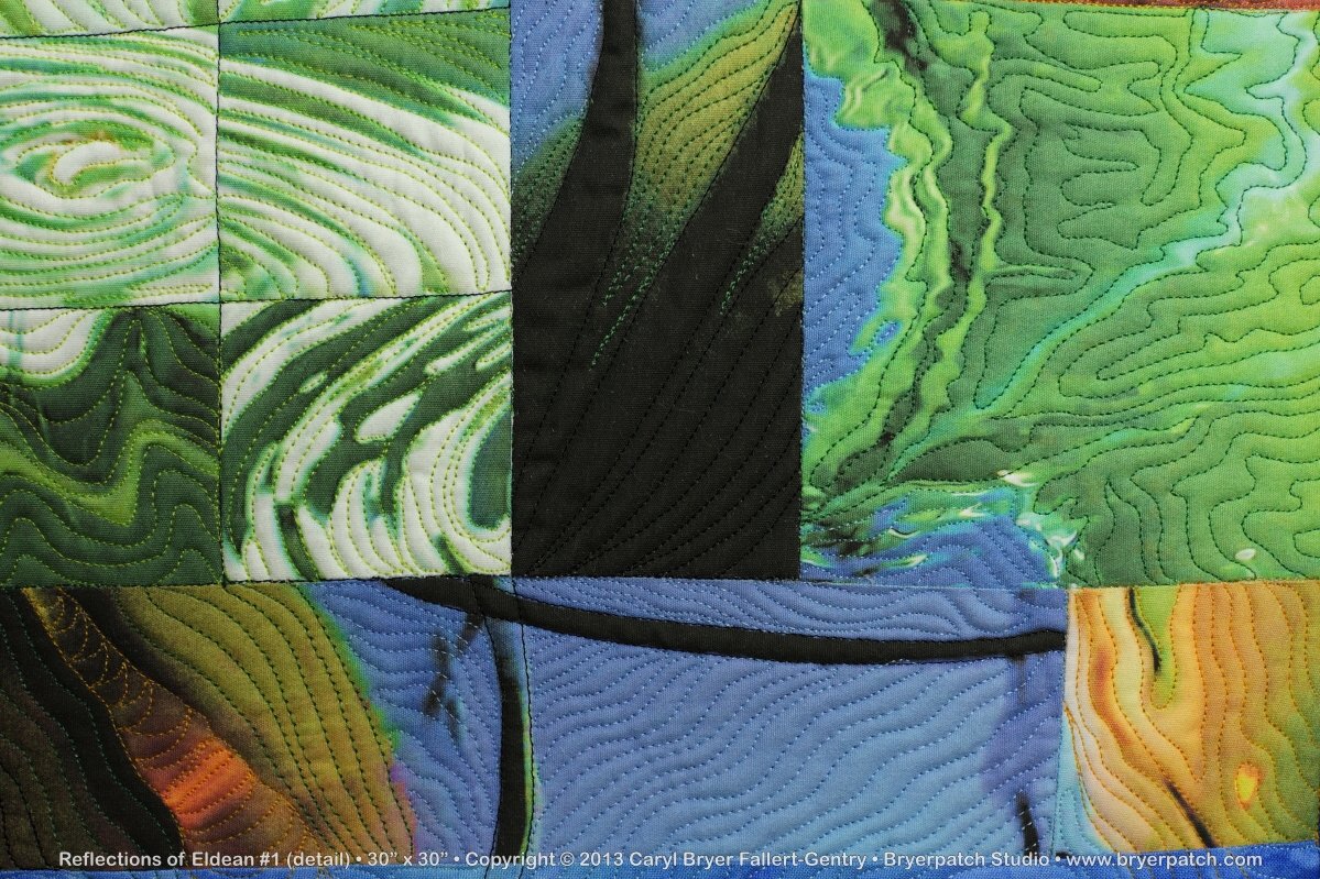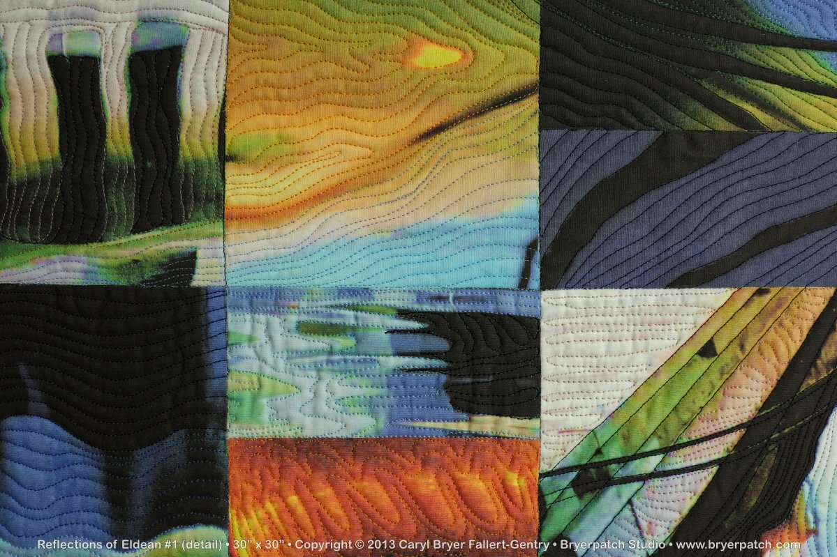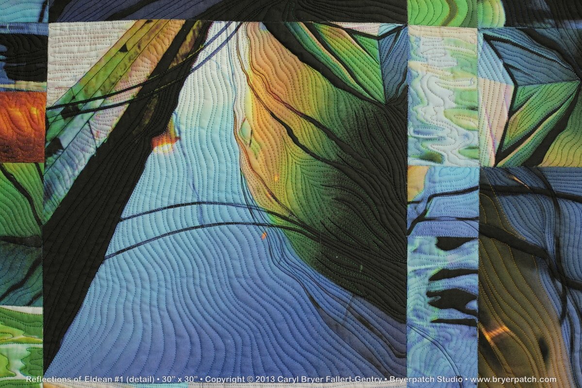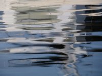 | The landscapes were beautiful everywhere we went but I also became facinated by the patterns of reflections in the water. I took many close-up photos of reflections. The images in this quilt came from reflections of Eldean at the dock in Bellingham, Washington. Below are just a few of these photos. |