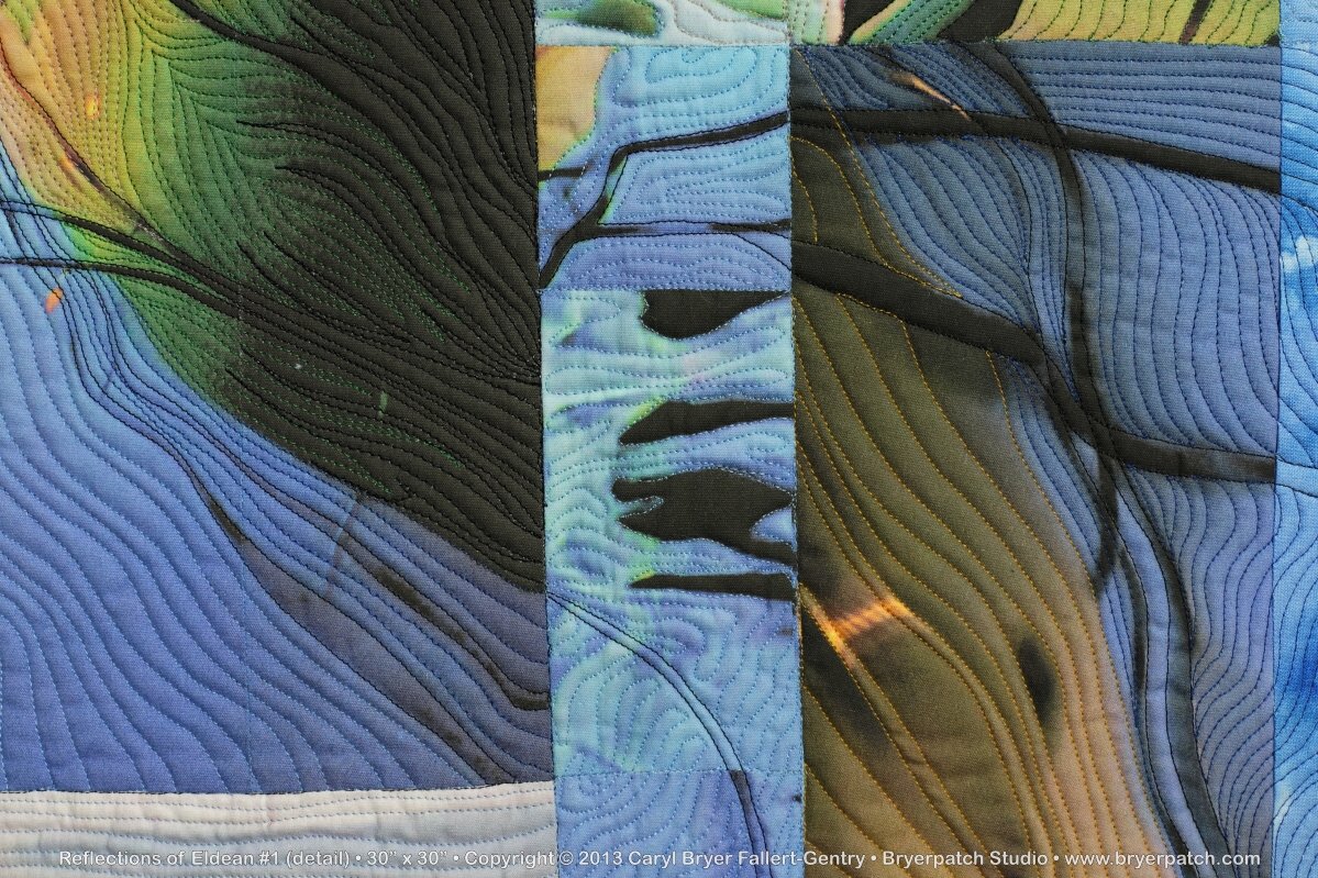 proportions of the squares and rectangles, which have the same design/layout as my dandelion quilt, Splendor in the Grass #3. The digital images are surrounded by a border of blue fabric from my Splash collection for Benartex