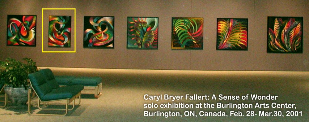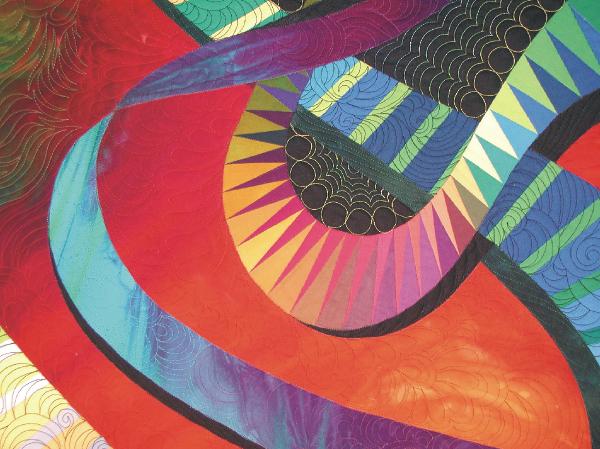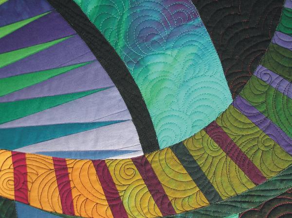 The areas between this complex piecing were then filled with larger pieces of fabric which was hand painted with dye in many different patterns and colors. |