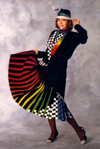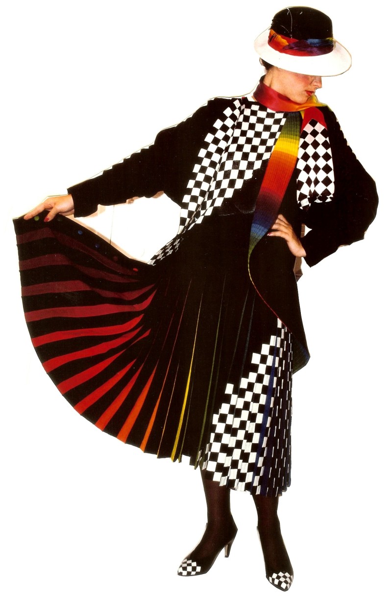 This ensemble began with a skirt that is a color study in motion. When still, the skirt appears to be solid black, with a diagonal panel of white checks on the left side. When in motion, the 54, extra deep pleats swing out to reveal a complete spectrum of 27 rainbow colors on the undersides. The skirt is meant to swing and twirl. The skirt closes on the right side with covered buttons in ten shades of the rainbow.