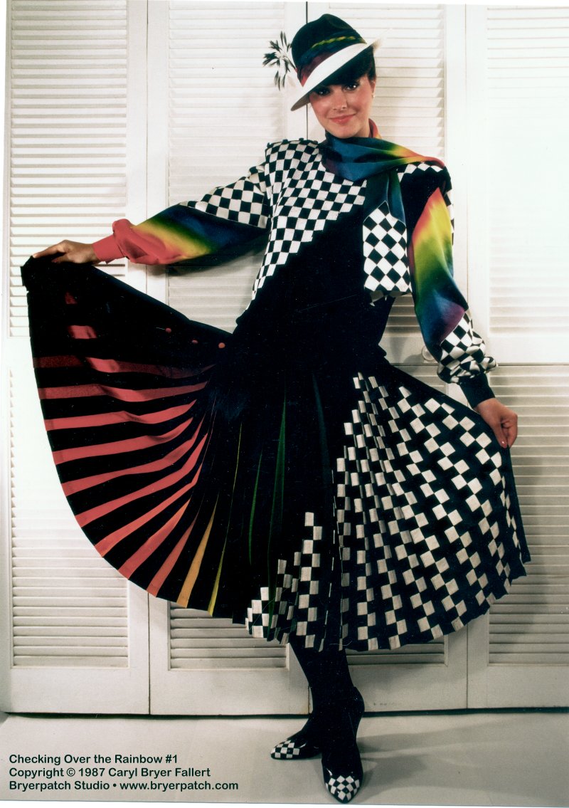 The matching sweater vest was intarsia knit on a knitting loom, using shiny rayon yarn. It is solid black, with white checks covering the right shoulder in a diagonal panel. The neckline of the sweater is closed with rainbow colored silk buttons along the shoulder. Under the sweater-vest is a silk-satin blouse, with long sleeves and a matching scarf. The sleeves of the blouse and the scarf were hand painted in rainbow hues and black and white checks, using Jacquard silk dyes and a gutta resist. Both the sweater vest and blouse were damaged beyond repair during cleaning (around 2009). A matching hand-painted silk scarf remains.