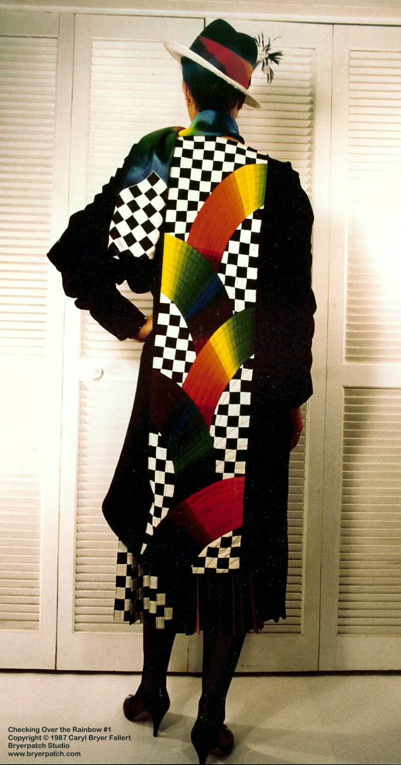 The coat, (sold in about 1988), is based on a circle. In the front, the edges of the circle fold back into lapels. The lapels were string pieced with graduated hand-dyed silk in a rainbow gradation on one side. On the other side, black and white strip-pieced fabric was string pieced to make a curving checkerboard. The rainbow arcs and checkerboard are echoed in the back panel of the coat.