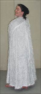 The star of the show, of course is the brilliant yellow dandelion blossom. The petals of this blossom were made from 18 yards of crepe backed silk satin, hand dyed in five shades of yellow. The silk was cut into bias strips and sewn to the long circular skirt in sixteen concentric rows from top to bottom.