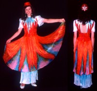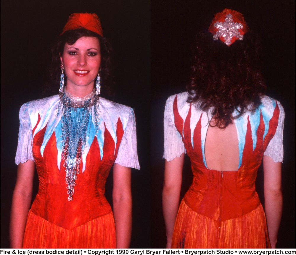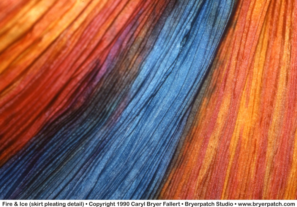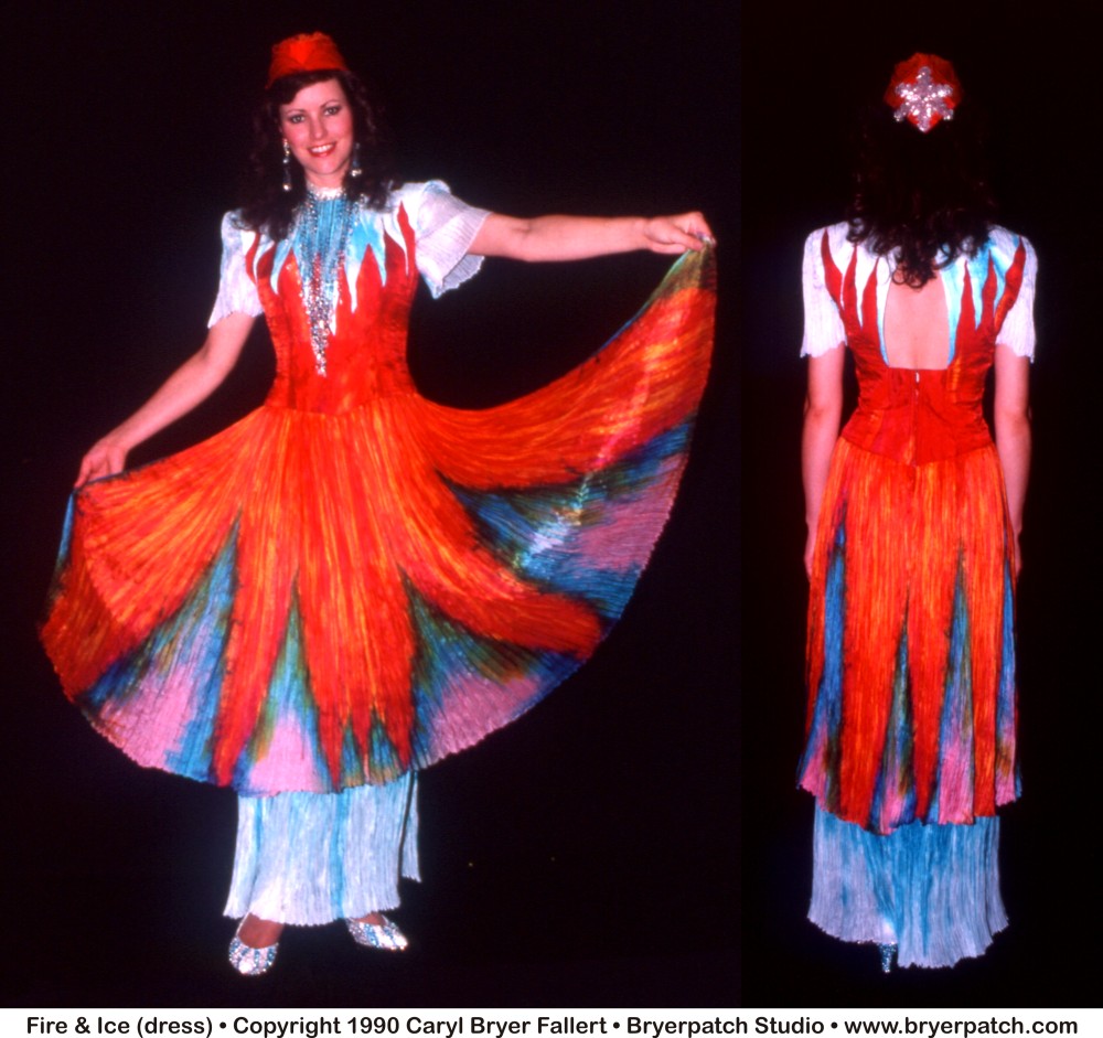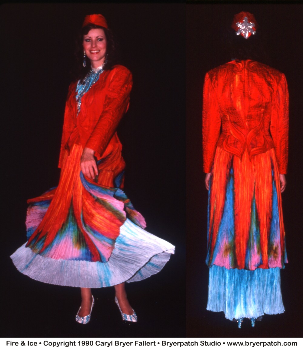 The skirt of the dress is constructed in two layers. The top layer, attached to the bodice, is hand painted in flame colors. The bottom layer, attached to an underskirt, and flowing from the bottom of the overskirt to the floor, is painted in the colors of ice. The skirt is made from eleven yards of 5mm (very light weight) china silk, which was hand pleated by wrapping with string on a cylinder. The skirt hangs straight when still, and flares out to form a full circle, when the model twirls on the runway. It is meant to be in constant motion.