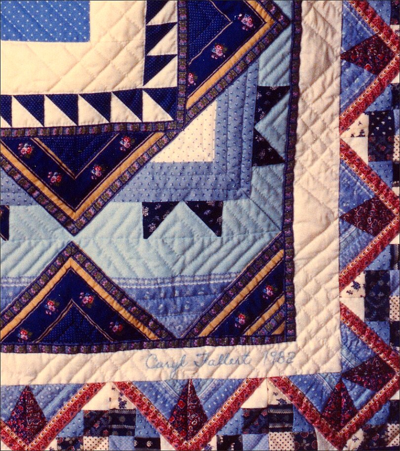 After the quilt was pieced, I began carrying it around in my garment bag and hand quilting on my out-of-town layovers. On a layover in Buffalo, New York in November of 1982, I ran out of thread, and the desk clerk at the Williamsville Inn sent me to a quilt shop a block away. Right at the front counter was the most wonderful calendar I have ever seen, full of quilts that were intended to be fine art. |