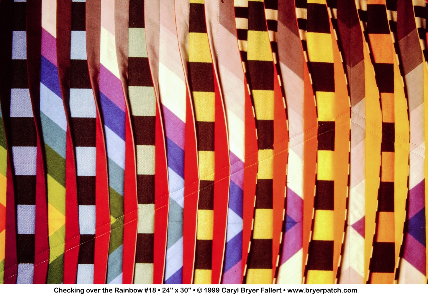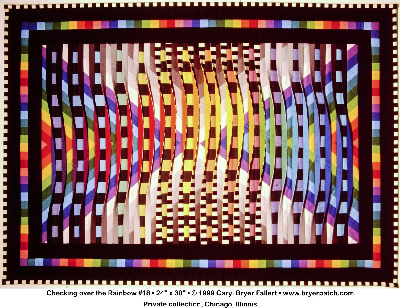 This is one of a series of quilts in which three dimensional, constructed tucks are incorporated into a pieced background. The background was pieced from strips of over-dyed striped fabric in 12 pure rainbow hues, alternating with strips of a diagonal, rainbow striped fabric. The alternating of background strips creates the illusion of black checks floating in space, with overlapping transparent triangles of rainbow colors.