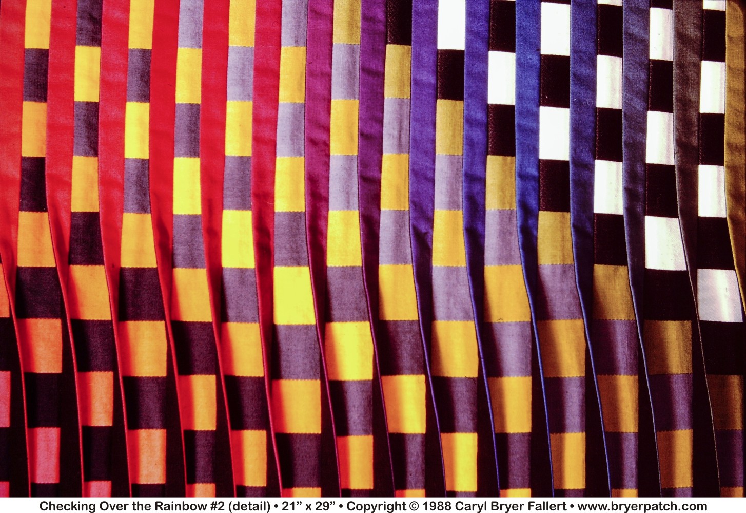 This is part of a series in which 1/2", constructed tucks are incorporated into a pieced background. This is also the first quilt in a sub-series exploring various relationships between checks and gradations of rainbow colors. Checking over the Rainbow #1 was an ensemble that I made for the Fairfield Fashion show in 1987. The background strips in this quilt are black and white 1" checks in the upper right corner and rainbow checks in the lower left.