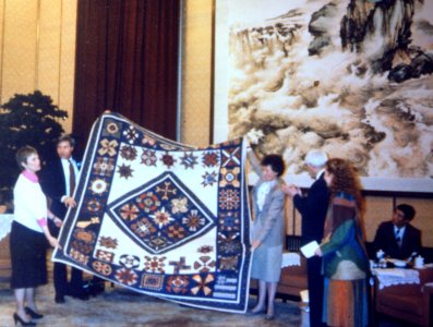The quilt became the official gift from our whole delegation. Originally the plan was to present the quilt to the mayor of Bejing at our opening banquet. At the last minute, however, we received an invitation to the Great Hall of the People from a high level official in the Chinese government, who, it happened, had been educated at the University of Chicago. We made a formal presentation in the Great Hall of the People, and made the evening news all over China. The women holding the quilt in the picture are Dr. Judith Wray, the leader of our delegation, and the Lieutenant Governor of Colorado.