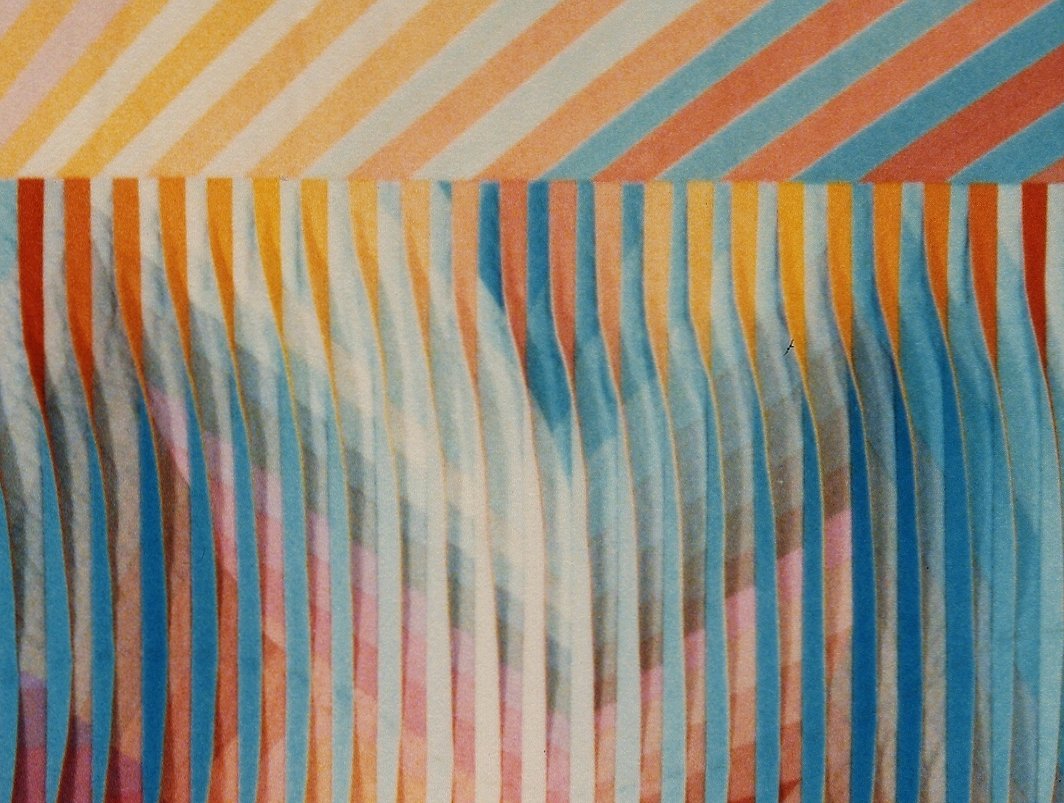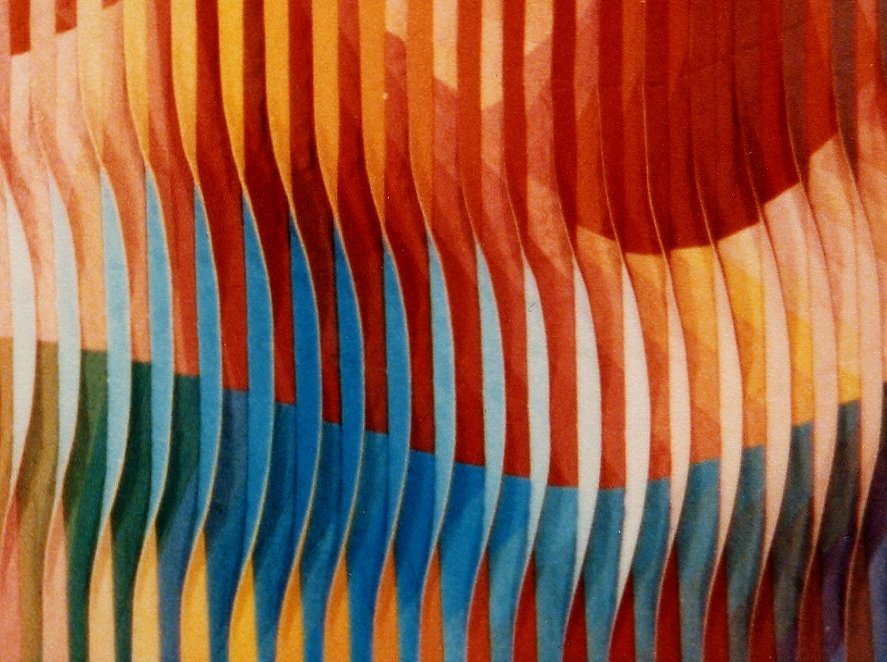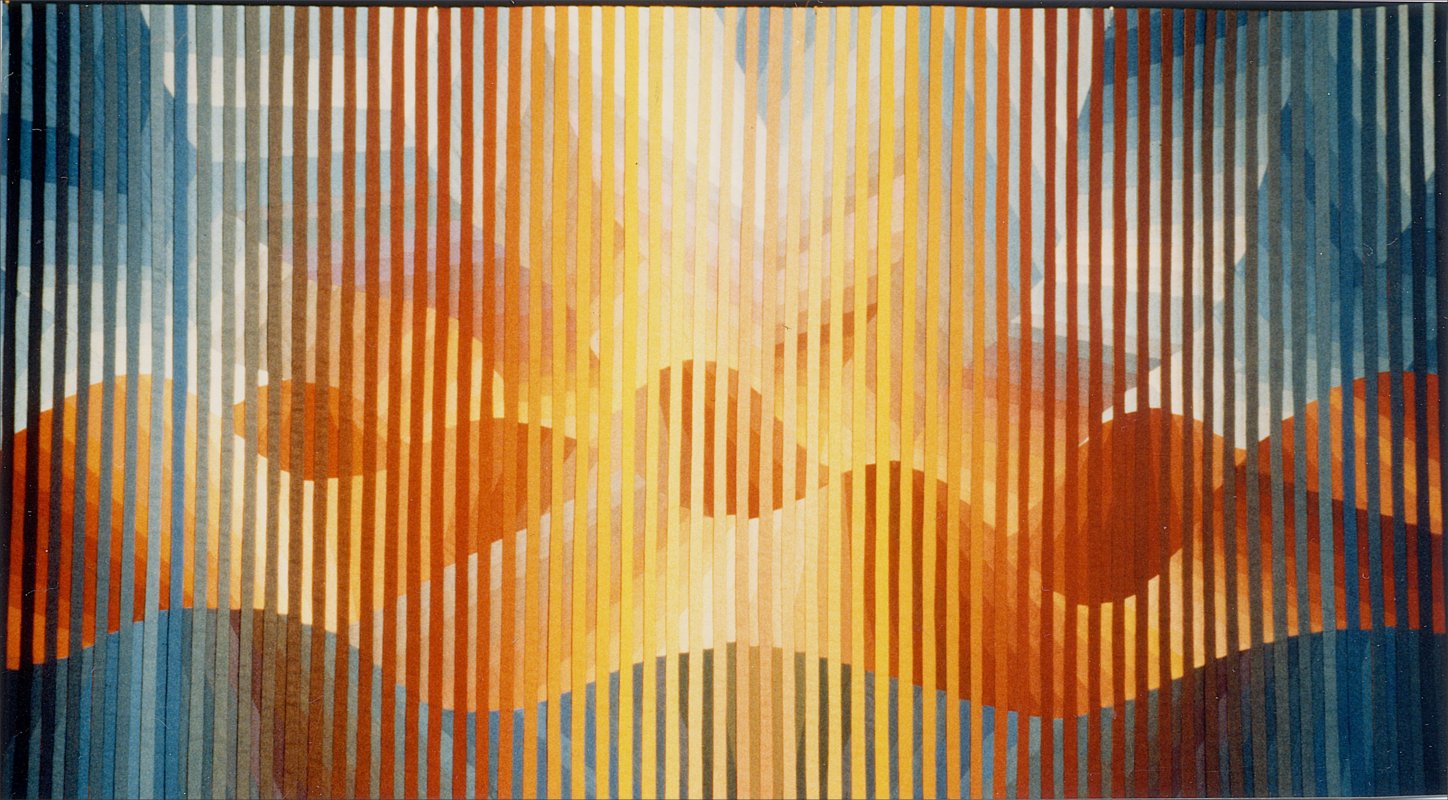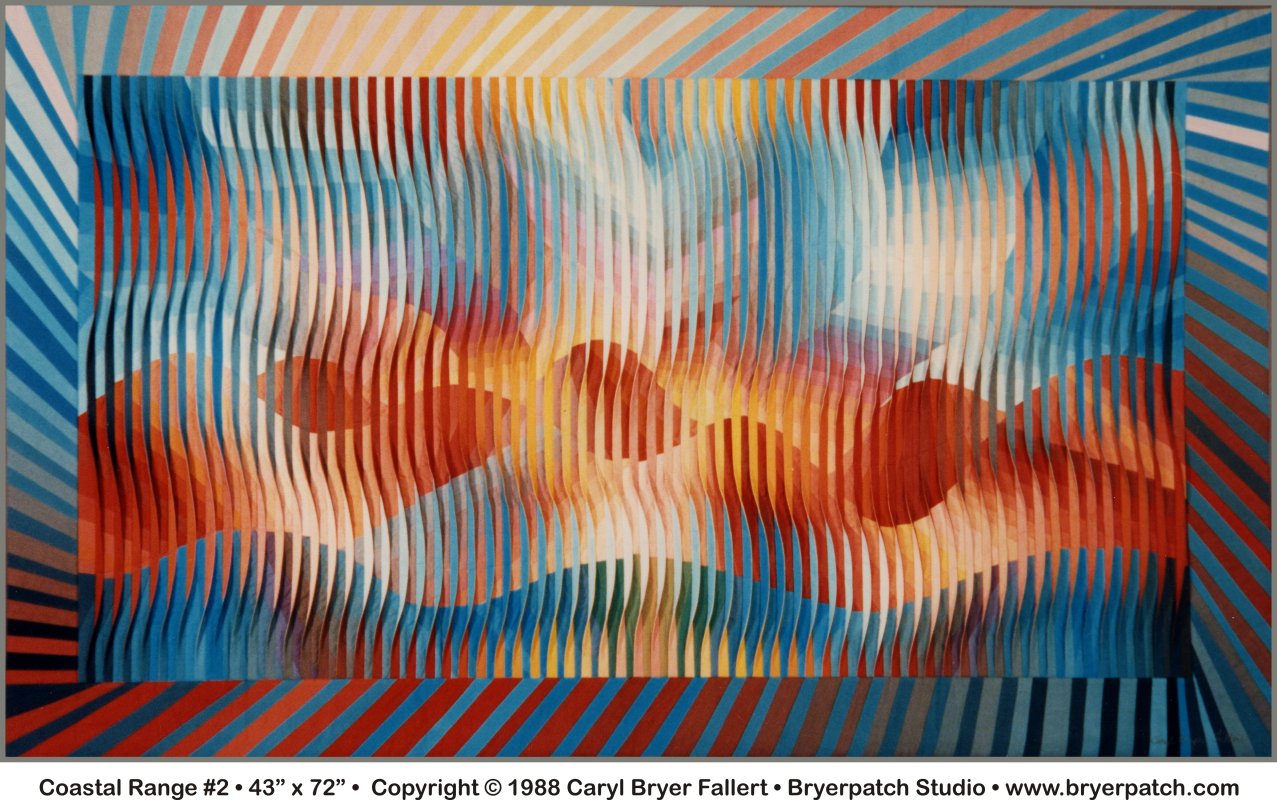 This is one in a series of quilts in which three-dimensional, twisted tucks are incorporated into a curving, string pieced background. Both the tucks and the background are pieced from 100% cotton print cloth, dyed in light to dark gradations of rust and turquoise and a color-to-color gradation from turquoise to rust. The background reminded me of the coast of southern California as it might be seen from the water. The illusion of movement in the background of the quilt is enhanced by the contrast between the front and back sides of the three-dimensional tucks as they twist across the surface of the quilt. Contrast is created by intersecting two different arrangements of light to dark gradations. A radiating string pieced border surrounds the three-dimensional center panel. The corners were joined at angels other than 90 degrees, and appear to spiral.
