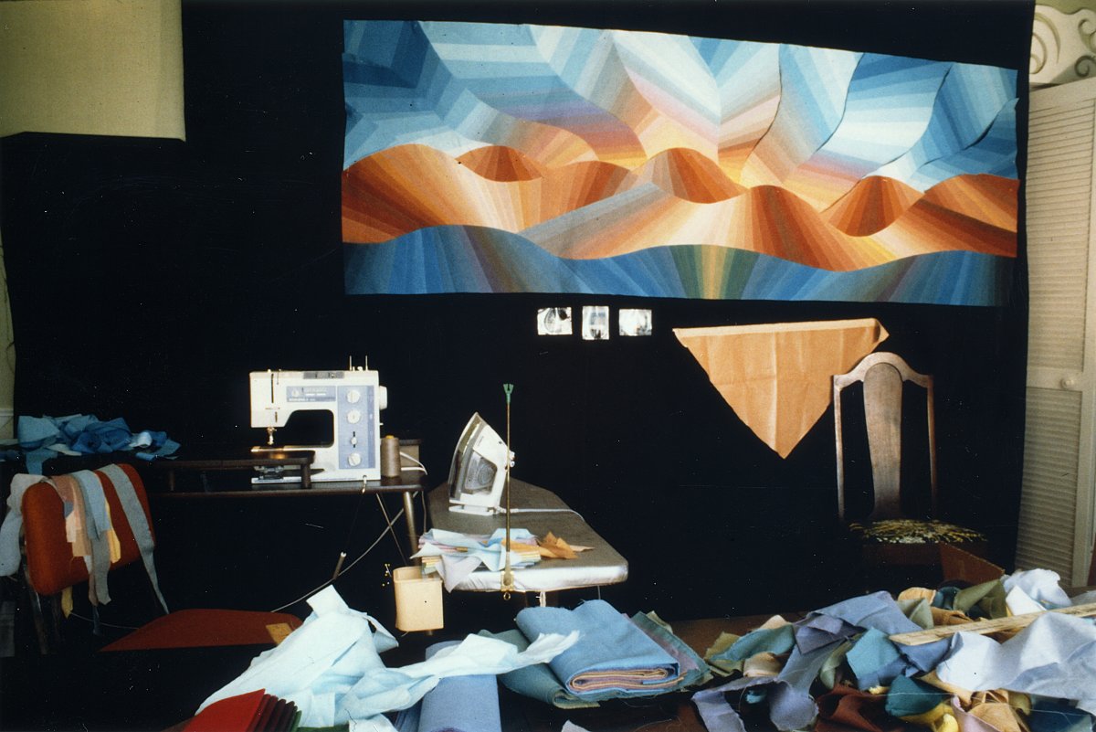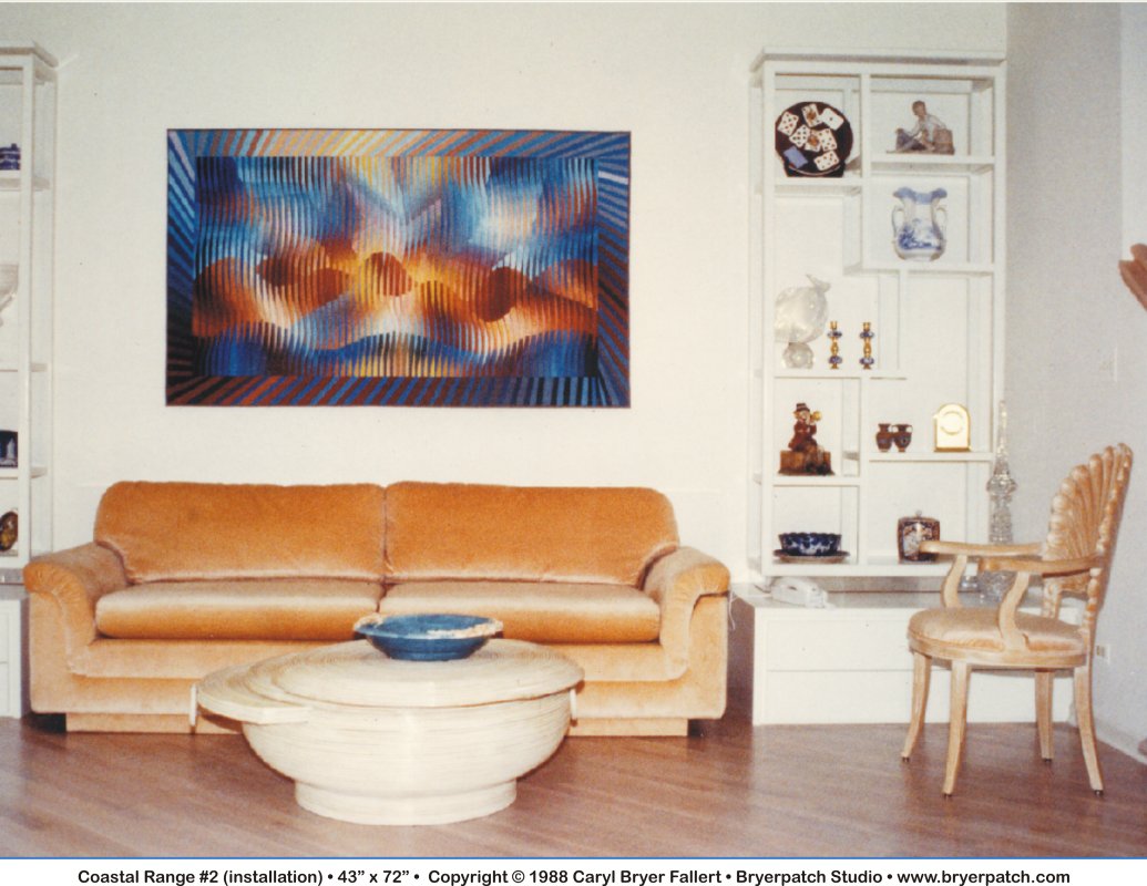 The background was string pieced onto a paper foundation. The three-dimensional tucks were constructed separately. When the background was finished, the paper was removed and it was sliced into 1.5" wide strips. The strips were pieced back together with a tuck in each seam allowance, so the finished width is one-third less than the original width of the background panel. The three photographs under the background panel are pictures of the home where the commission will be installed. The triangle of fabric is the upholstrery fabric on the sofa over which it will hang. |