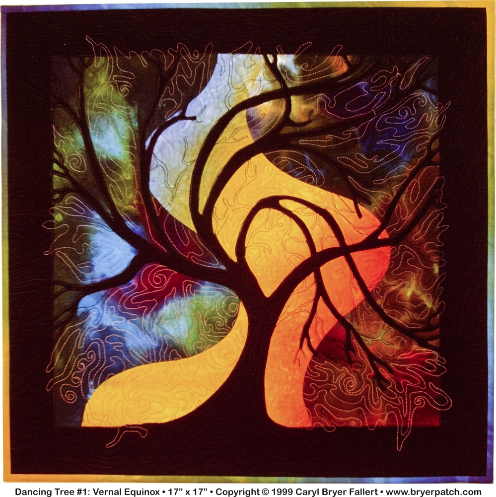This was a little experiment in appliqueing a delicate black applique over a pieced background. The background fabrics were hand painted with fiber reactive dyes and pieced in a wavy pattern. The tree and border were cut out as one piece and fused to the pieced background. The edges were finished with a very narrow black zigzag stitch. The quilting added more branches to the tree and carried some of the colors out into the border. The binding was made from hand painted fabric. |