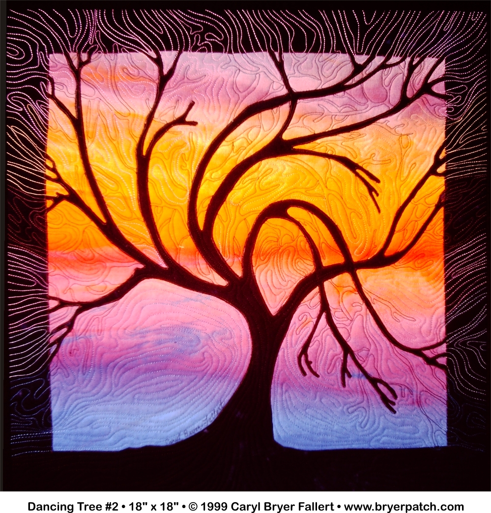 This was my second version of the black tree appliqued over a colorful background. This was eventually made into a pattern. The background fabric was hand painted with fiber reactive dyes. The tree and border were cut out of a single piece of black fabric and fused to the background. The edges were finished with a very narrow black zigzag stitch. The quilting added more branches to the tree and carried some of the colors out into the border. |