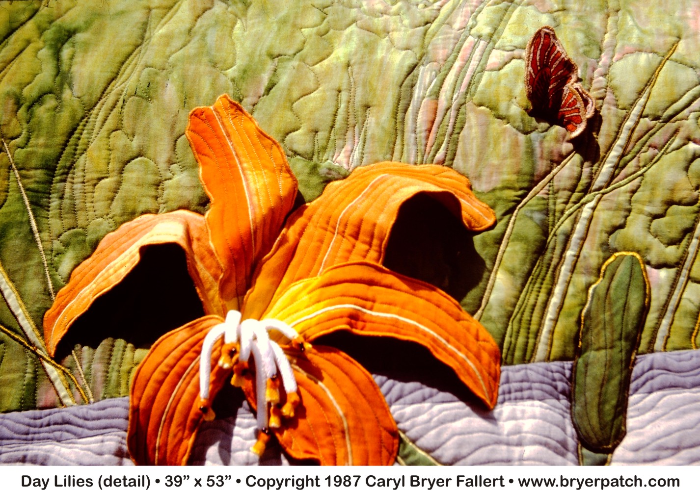 This quilt was inspired by the day lilies that grew under the fence in front of our Oswego, IL house. My intention was to capture the essence of the flowers. My challenge was to show the stages in the life of a day lily, while keeping the composition as simple as possible. The background fabric was painted with fiber reactive dyes and the lily fabric was painted with textile paint (see picture below). The lilies are sculptural and somewhat aggressive. The real lilies were planted under the fence to choke out the grass and weeds, so we wouldn’t have to mow there, so the aggressiveness is appropriate. The surface texture was achieved by combining sculptural machine applique with machine embroidery and quilting. The back of the quilt was pieced from fabrics left over from the front. |