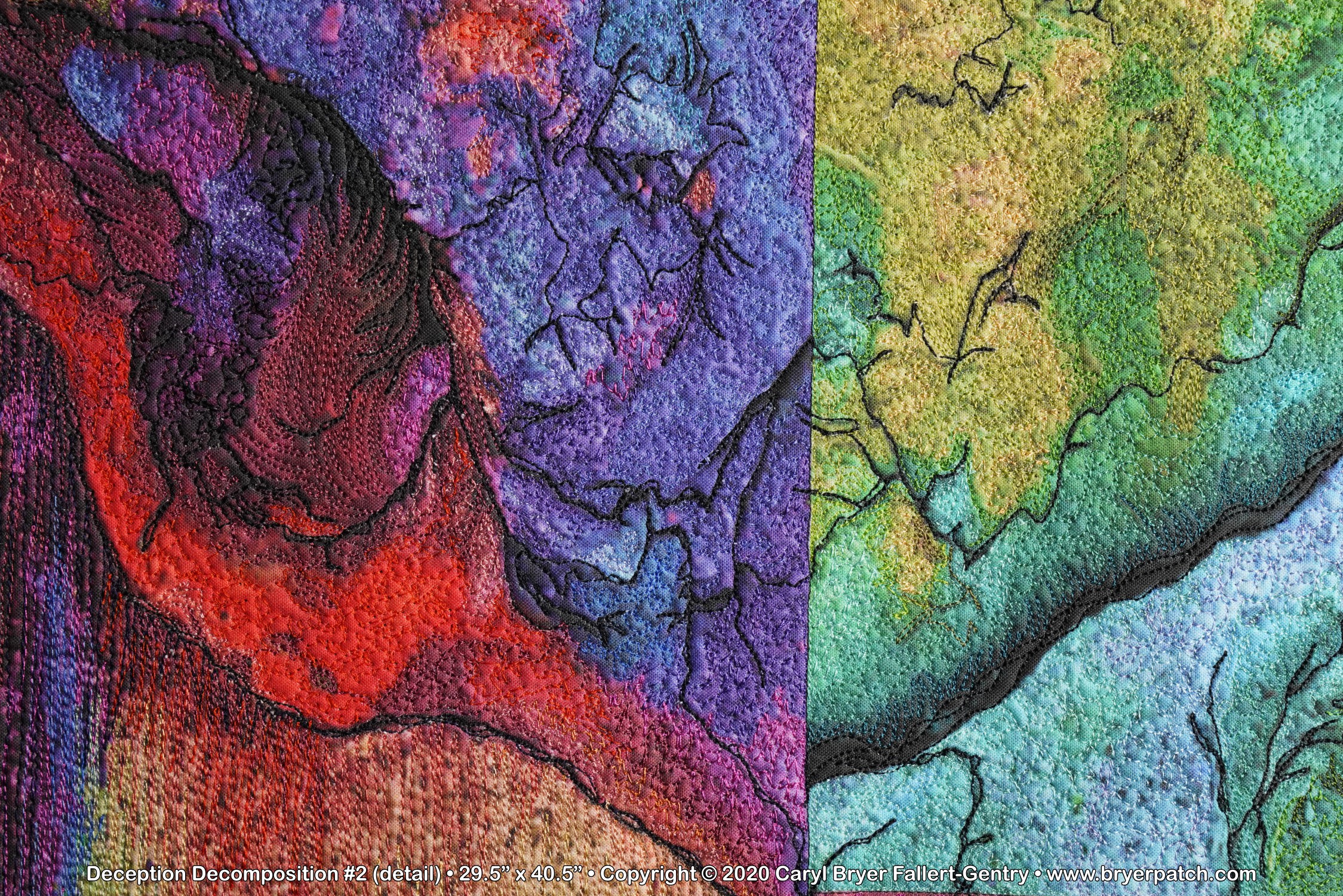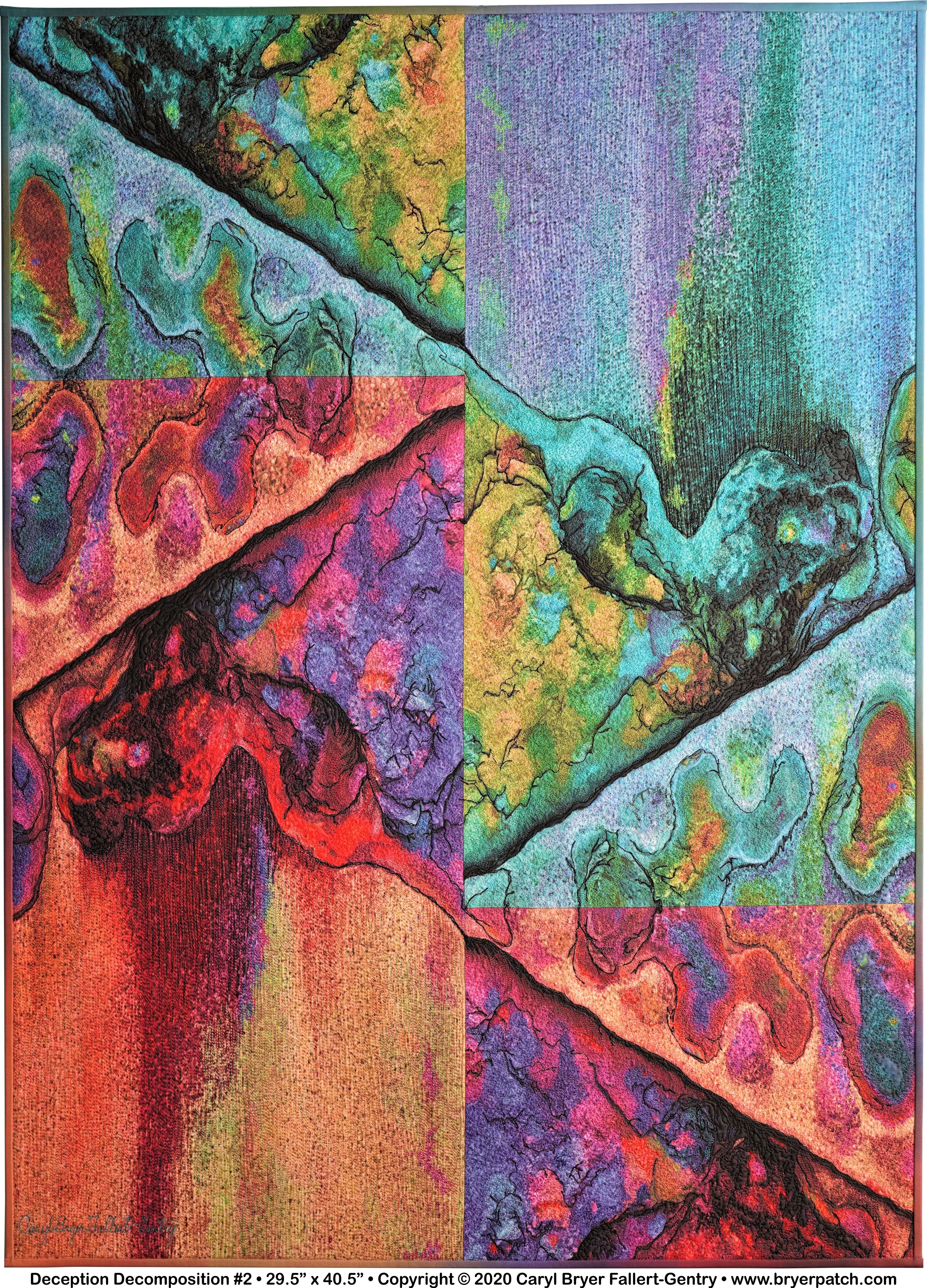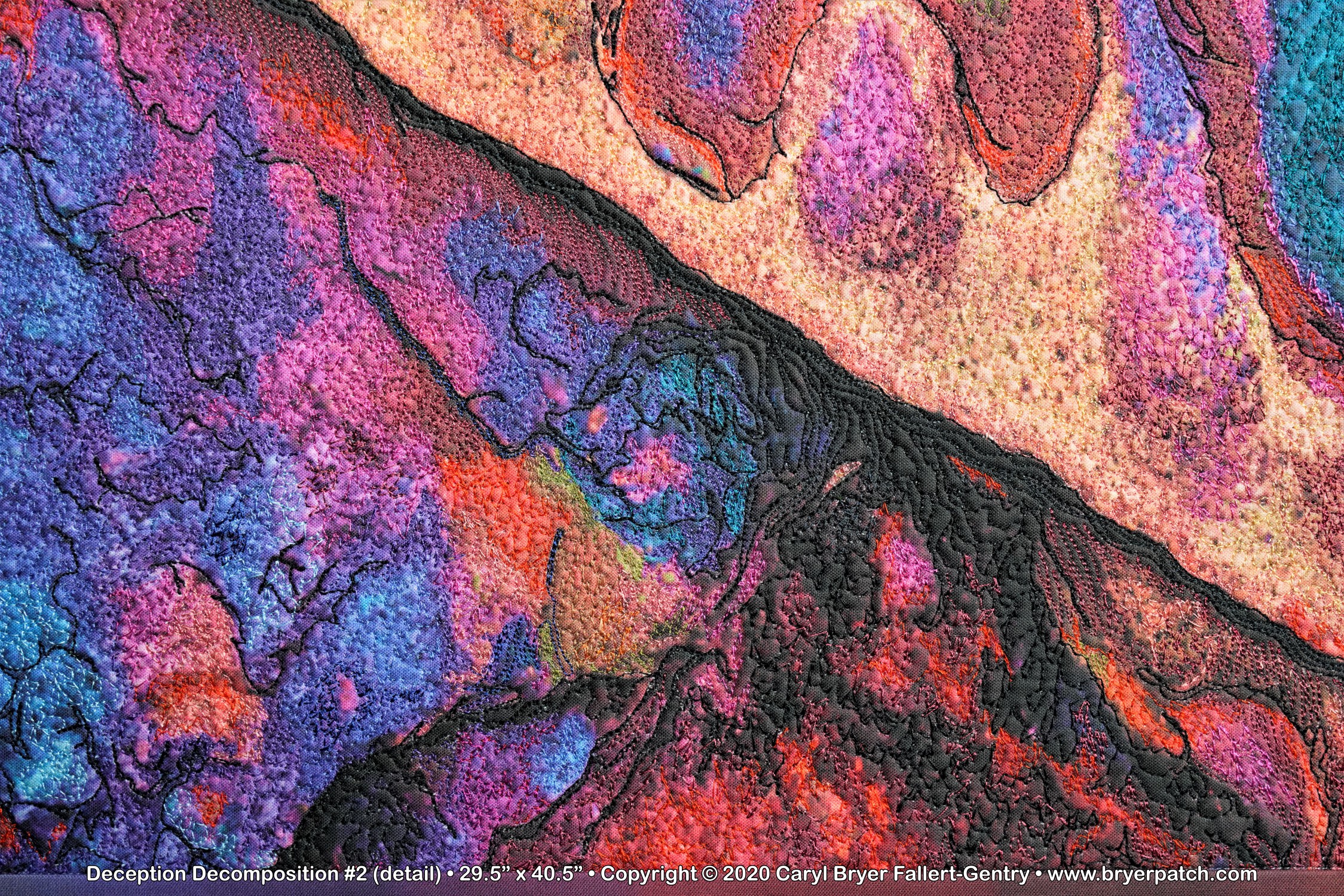 The image for Deception Decomposition #2 was cropped from one of these photos. The image was reshaped, recolored, and digitally painted. The image was duplicated and recolored again in complimentary colors (directly opposite on the color wheel). The duplicated images were rearranged to make a composition with repeating shapes and lines that continue from one side to the other. The final, whole design was printed on cotton fabric by Spoonflower. It is very heavily quilted, to the level of thread painting, with many different colors of polyester and acrylic thread. The backing fabric is from my Tye-Dye collection for Benartex. The binding strips are one-of-a-kind fabric, designed especially for this quilt. |