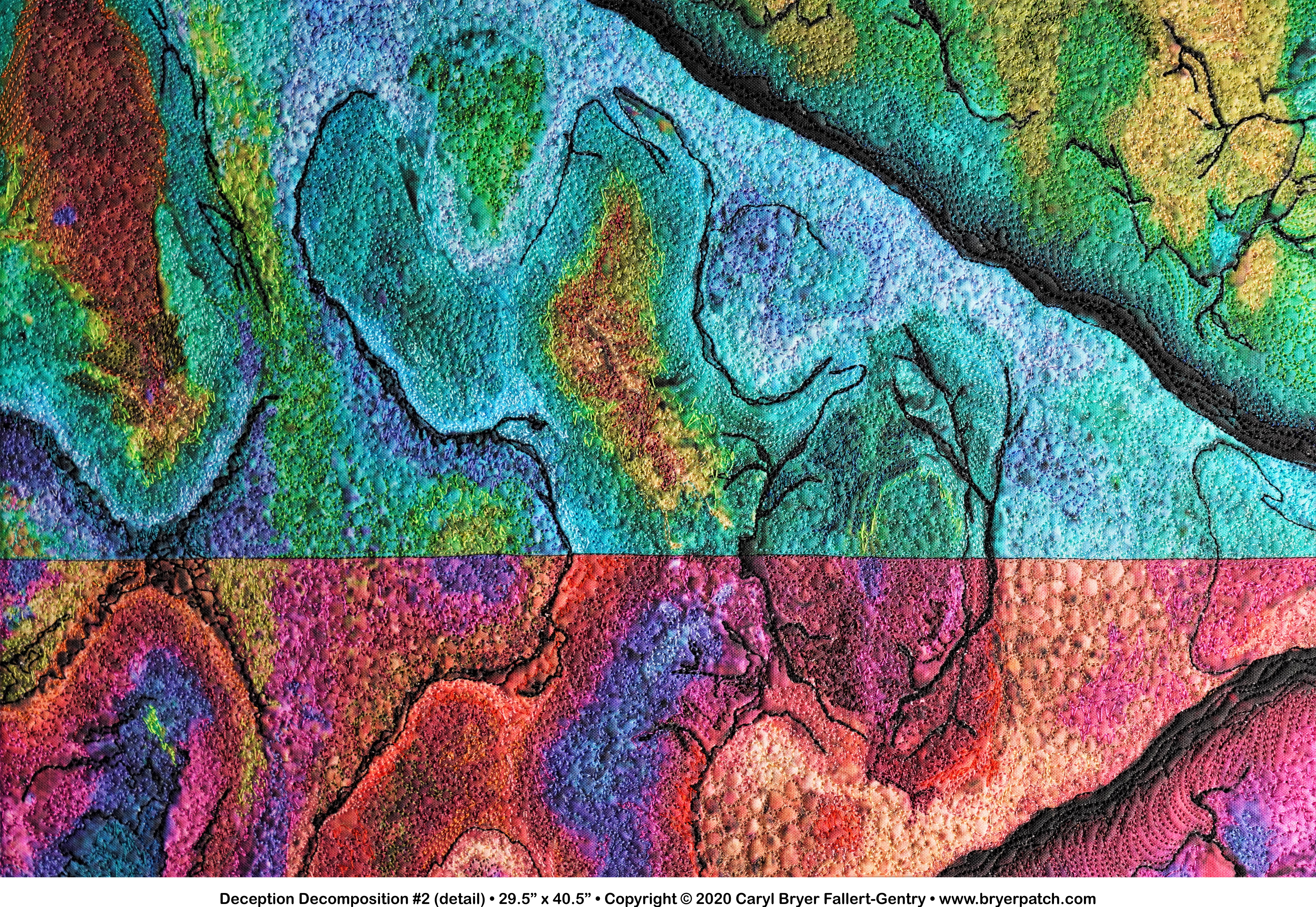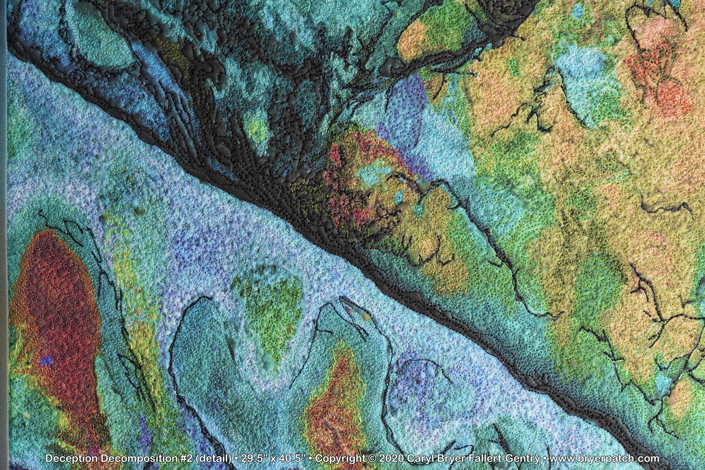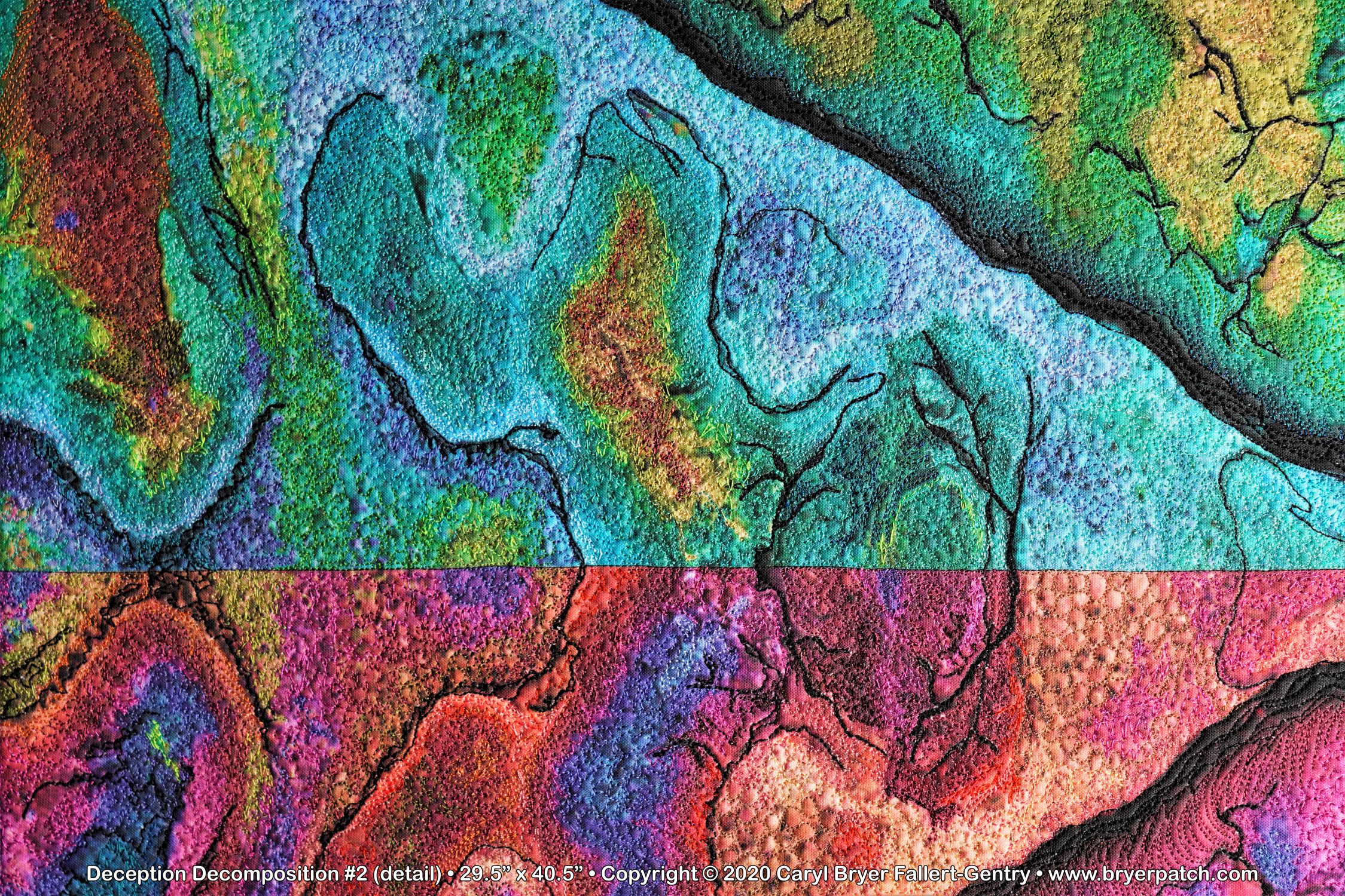 The image for Deception Decomposition #2 was cropped from one of these photos. The image was reshaped, recolored, and digitally painted. The image was duplicated and recolored again in complimentary colors (directly opposite on the color wheel). The duplicated images were rearranged to make a composition with repeating shapes and lines that continue from one side to the other. The final, whole design was printed on cotton fabric by Spoonflower. It is very heavily quilted, to the level of thread painting, with many different colors of polyester and acrylic thread. The backing fabric is from my Tye-Dye collection for Benartex. The binding strips are one-of-a-kind fabric, designed especially for this quilt. |