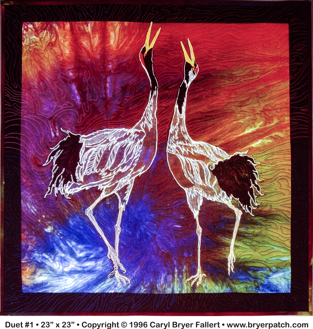 This is a small study in creating a focal point entirely with quilting. The background fabric was painted with fiber reactive dyed. The birds were stitched with contrasting top-stitching thread. The black areas of the birds will inked in, and some of the white areas were shaded in with white pencil.