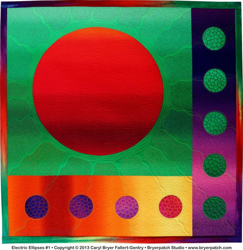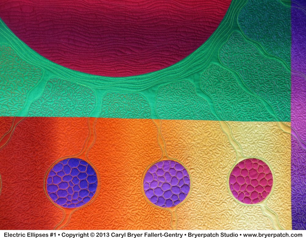 After piecing the very complex design for Corona #3, I decided to make another composition, based on circles, that was much simpler and more geometric. One of my (as yet unrealized) goals has always been to make a piece that shows as much restraint as a Mark Rothko painting. This was a step in that direction. The top was pieced from four fabrics in my Gradations collection for Benartex and one fabric from my Ombre Strip collection was used for the binding. (available in our Internet