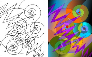 I turned my line drawing into separate shapes, and where the shapes crossed, I used different colors, which makes every shape appear transparent. The design was printed on cotton fabric by Spoonflower. It is wider than the standard Spoonflower fabric, so it was printed on two pieces of fabric and pieced together. Most of the piecing falls along the curving black lines. The quilting was done with many different thread colors and patterns. The binding strips were designed especially for this piece. The backing fabric is from my Atmosphere collection for Benartex. |