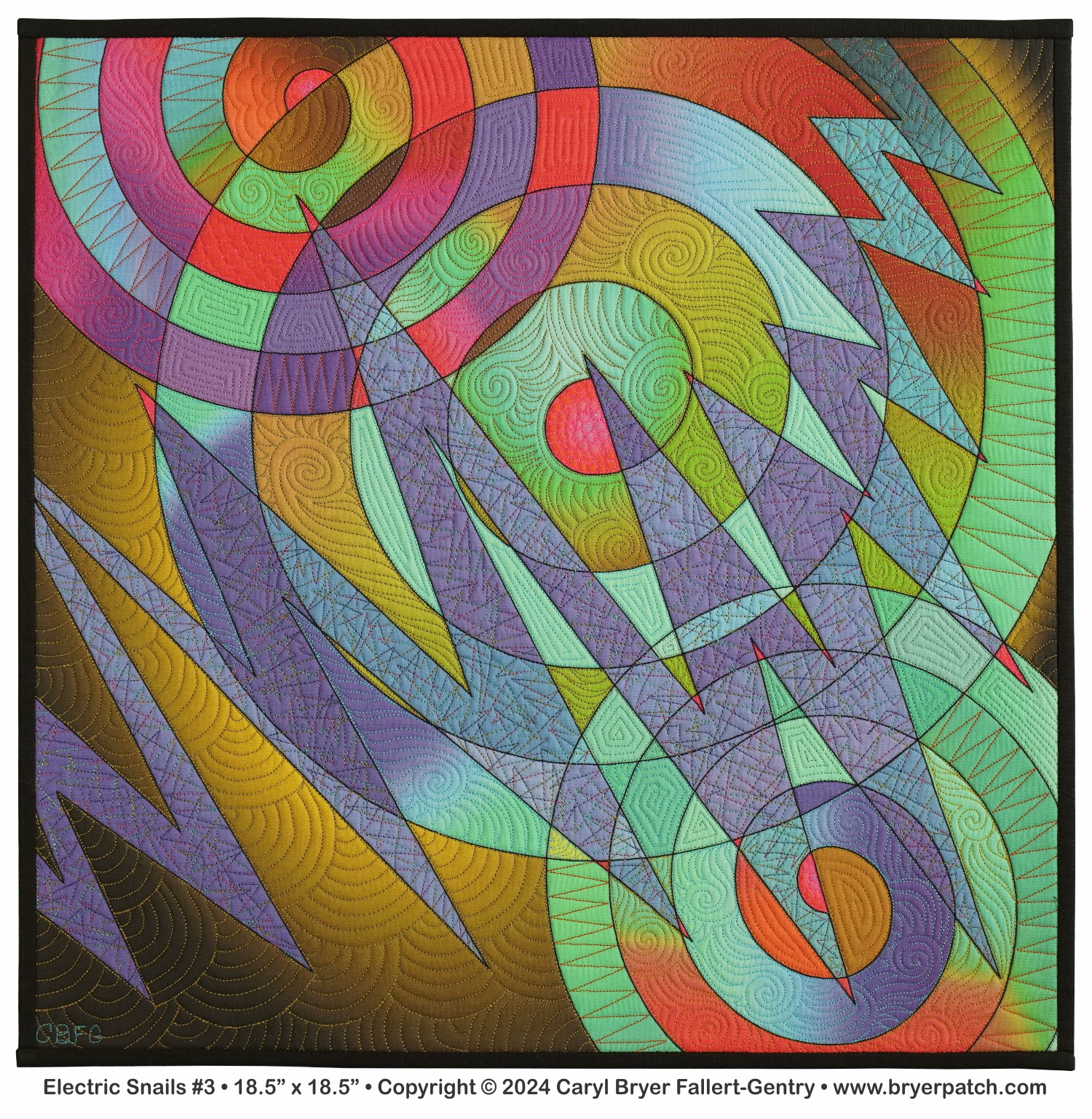 This is a smaller version of Electric Snails #2, rendered in slightly different colors. The design was printed on cotton fabric by Spoonflower. The quilting was done with many different thread colors and patterns. The binding is solid black. The backing fabric is from one of my original collections for Benartex.